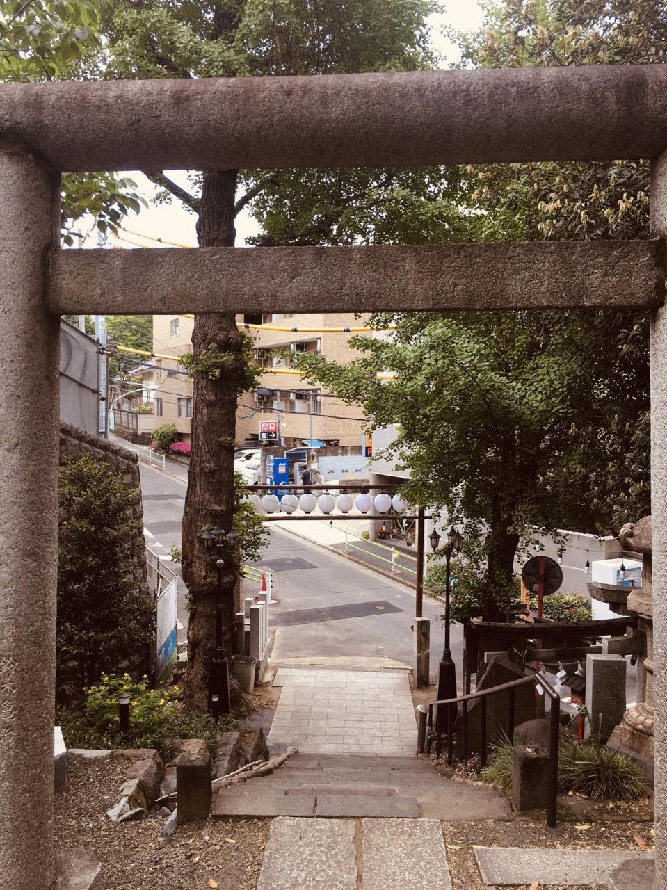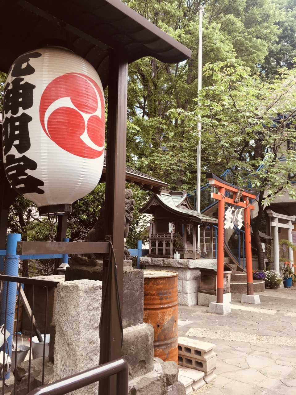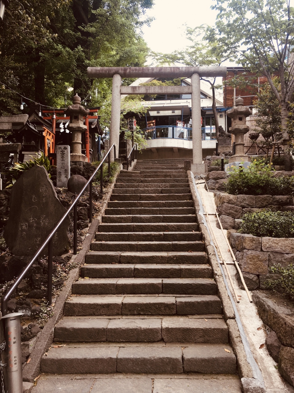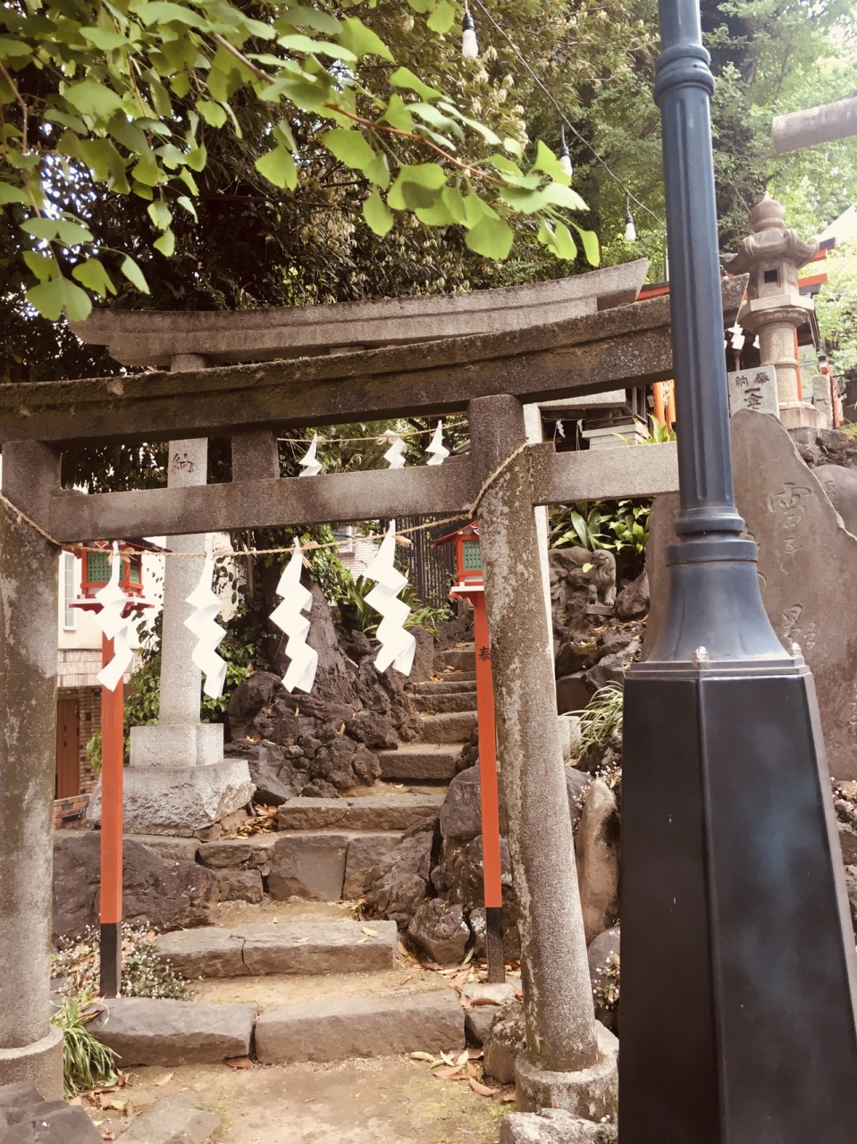 神明坂道沿いにありました。階段を上がると鳥居があり、境内に鳥居がいくつかありました。灯篭と古い祠もありました。社殿は三角形で階段を上がり参拝することとなります。おみくじがたくさんあり,裸電球が目立っていました。