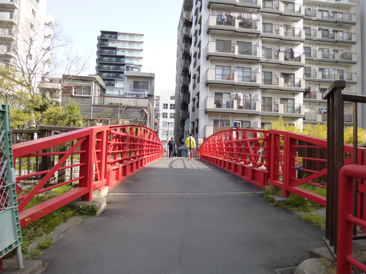 東西線・木場駅のすぐ南、大横川に架かる橋です。橋に続く道には石段があり、自転車も渡ることが出来ず歩行者専用の橋です。赤い欄干が印象的な小ぢんまりとした橋ですが、駅のすぐ南というロケーションから、通学や通勤に通る方が多いのに驚きました。