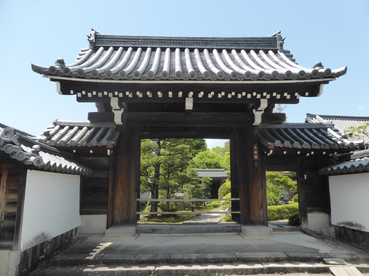 臨済宗大本山妙心寺の塔頭寺院のひとつで広大な妙心寺境内の北西側にあります。1645年(正保2年)松平忠弘が父・松平忠明の菩提を弔うために妙心寺154世・乳峯義元(にゅうほうぎげん)を開祖として創建されました。非公開寺院のため外観のみ見学しました。新緑の木々がとても美しかったです。