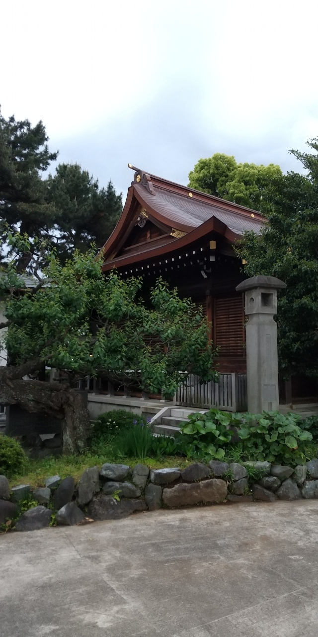 表側(南側・海側)から参拝すると、鳥居をくぐって階段を登った先にお社があり、という普通の構造にしかみえないのですが、裏には通りに降りる細い階段があり、その下、すなわちお社の下はお店と駐車場になっていたのです。街中の土地の有効利用なのでしょうが、高架下の商店街のようで面白い構造です。
