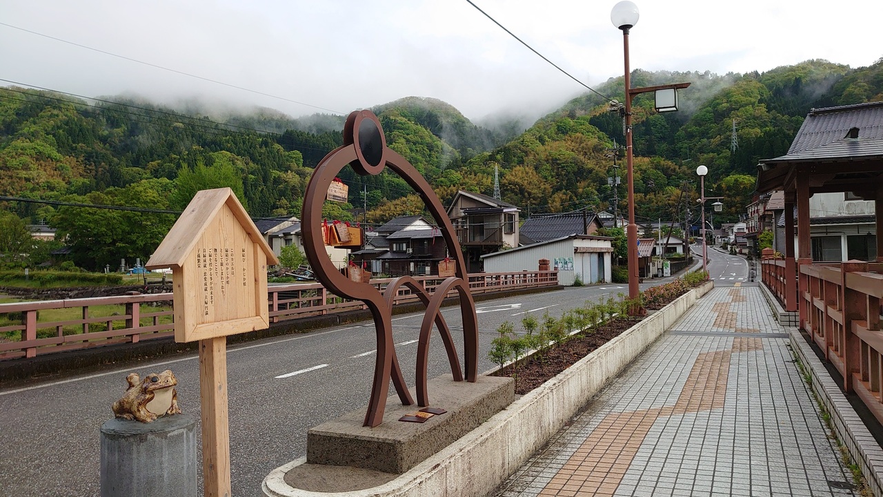 三徳川にかかる橋の一つです。陶器製のカエルがあって、なでると恋愛が成就するとのことで女性に特に人気があるんでしょうか。縁結びかじか蛙の絵馬は旅館や観光案内所で入手できるそうです。ほかの橋もですが、情緒がある橋です。
