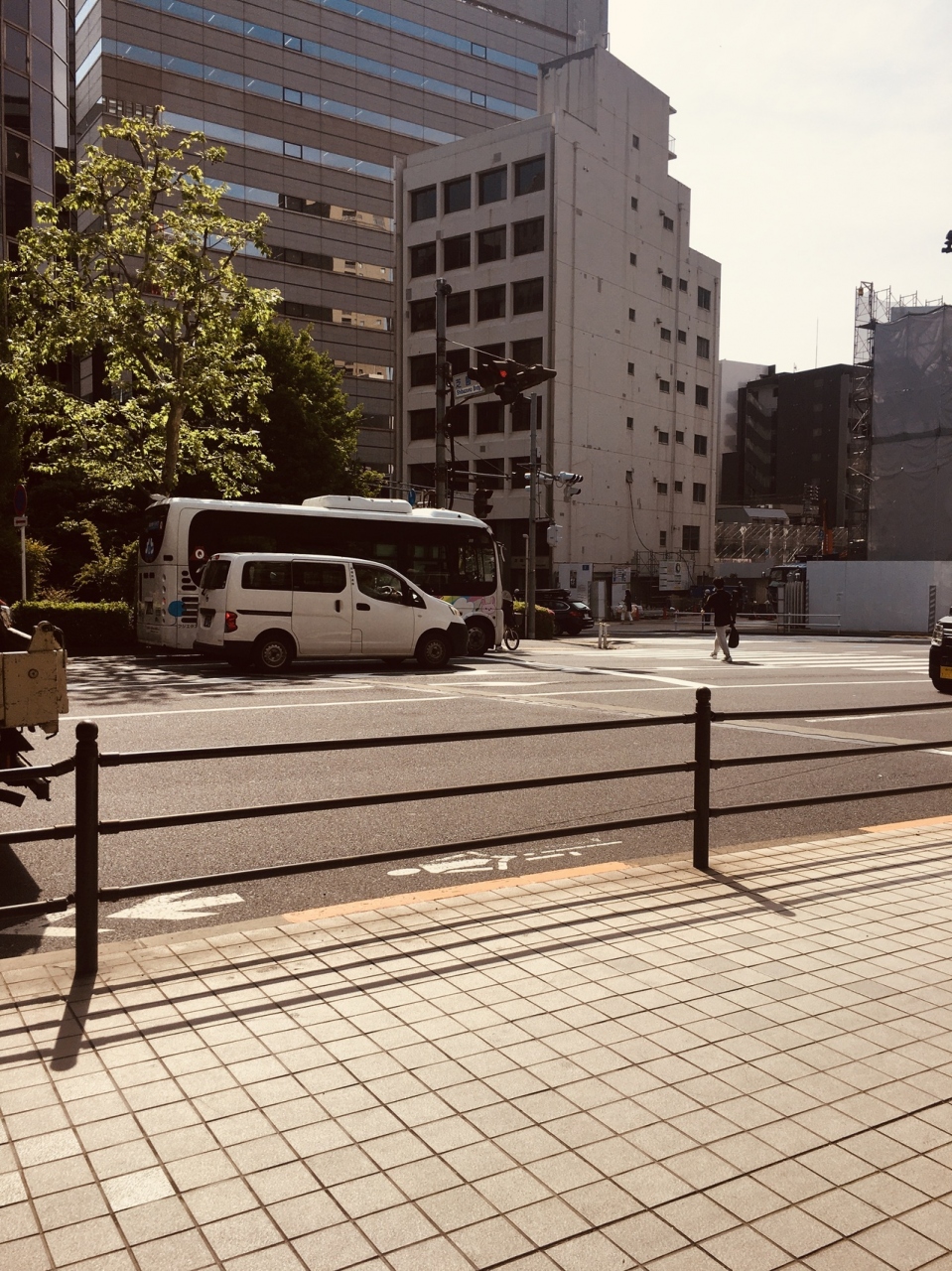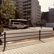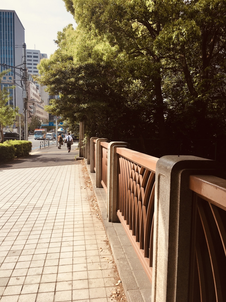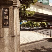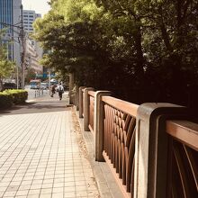 汚い川に架かる橋で車道、歩道ともに交通量が多く、上には首都高速道路が走っていました。横には横断歩道もあり、木の枝が橋まで伸びていました。橋の四方にある柱が重厚感があって、年季が入っていました。日陰になる部分が多い橋でした。
