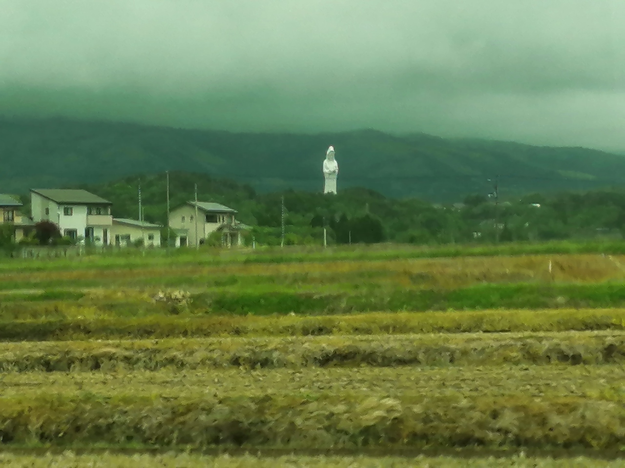 各地を旅していると、大きな観音様の像を見かけることがよくあります。このときも、会津若松駅から郡山駅に向かう電車の中から予期せず見ることができました。あまり高い建物がないせいもあってか、とても車窓で目立っていました。