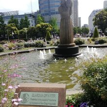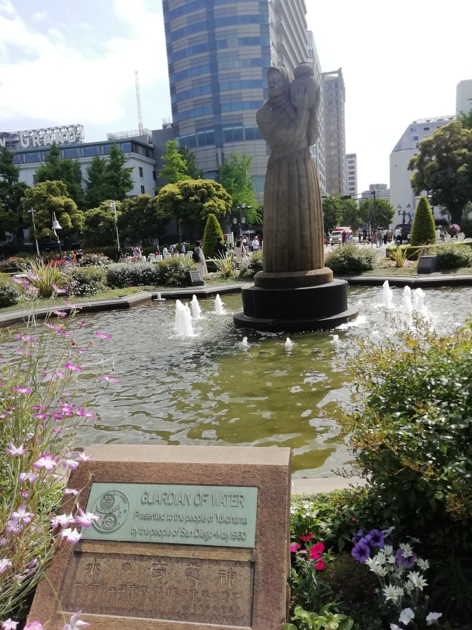 山下公園の中、氷川丸の近くにある噴水に中央に立っている像です。噴水の周りには色とりどりのお花が植えられていて、ベンチが並んでいます。人々の憩いの場所といった雰囲気があります。噴水は、夜はライトアップされるので、とても綺麗です。