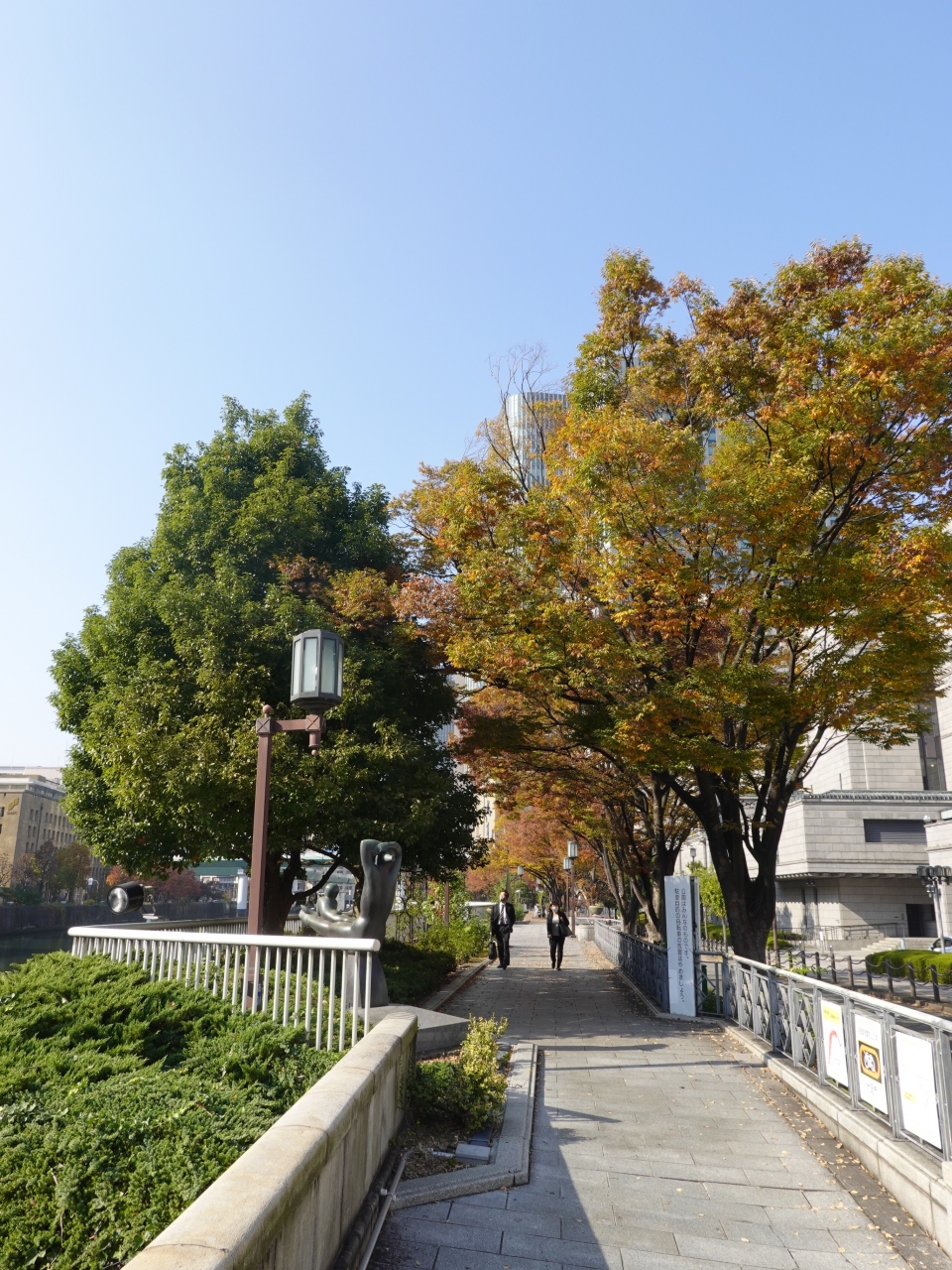 中之島を囲む2つの河川、土佐堀川と堂島川沿いに設けられた遊歩道です。訪れたのが11月の中旬で、街路樹が色づいており散策に最適な季節でした。歩くこと自体が楽しいですが、遊歩道には史跡やオブジェなども点在しており、中之島の歴史を感じることも出来ます。