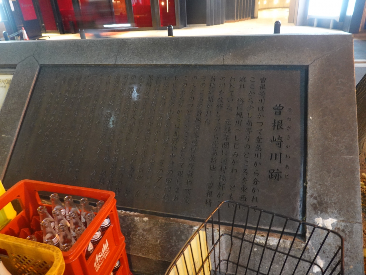 堂島のホテルに宿泊した際、夕食時に「曽根崎川跡碑」の前を通りかかりました。その名の通り、かつてこの場所に流れていた曽根崎川の跡地を記す史跡で、詳しい案内書きが刻まれています。残念だったのは史跡の周りに飲食店の空き瓶などが積まれていたこと、見たくない光景でした。