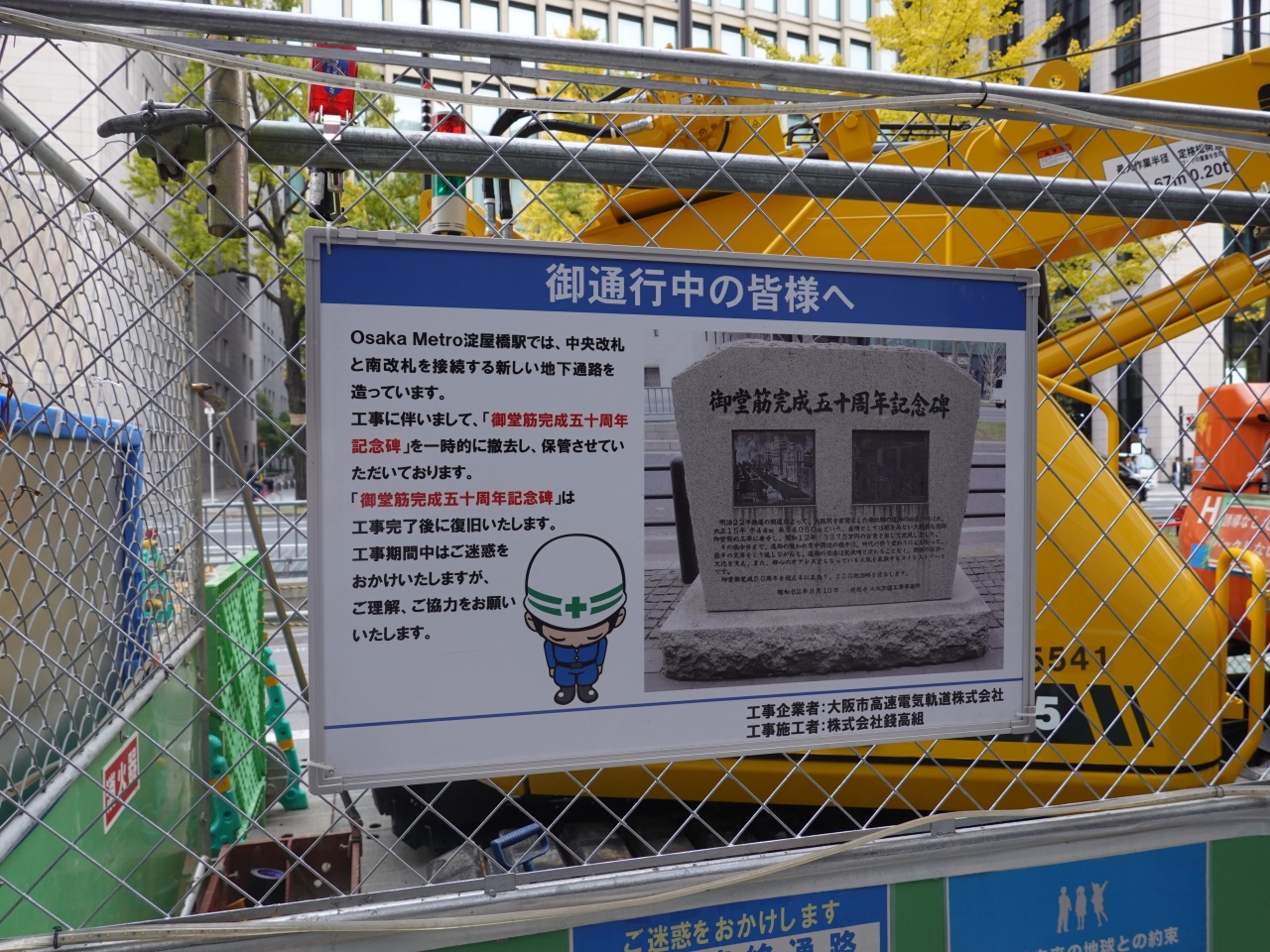 淀屋橋駅のすぐ近くにある石碑です。グーグルマップを頼りに足を運びましたが、あいにくの工事中で一時的に撤去されていました。工事の柵には看板が設置され、史跡が一時的に撤去されていることを伝えるとともに、史跡の写真が大きく掲載されていました。観光客にはありがたい配慮です。