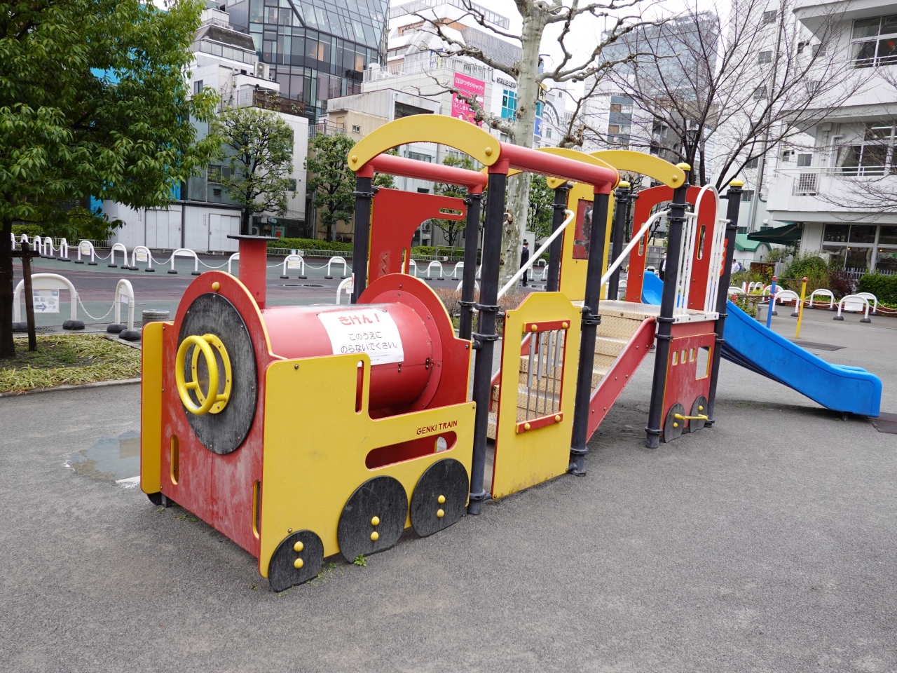 新橋駅前のSL広場から西へ2分ほど行ったところに、桜田公園があります。通り抜けていく人も多いですし、会社員や子供たちの憩いの場にもなっていて、人の多い公園です。公園の中央にはカラフルなSLの遊具があり、新橋らしさも感じました。関東大震災後の震災復興として造られた歴史ある公園でもあります。
