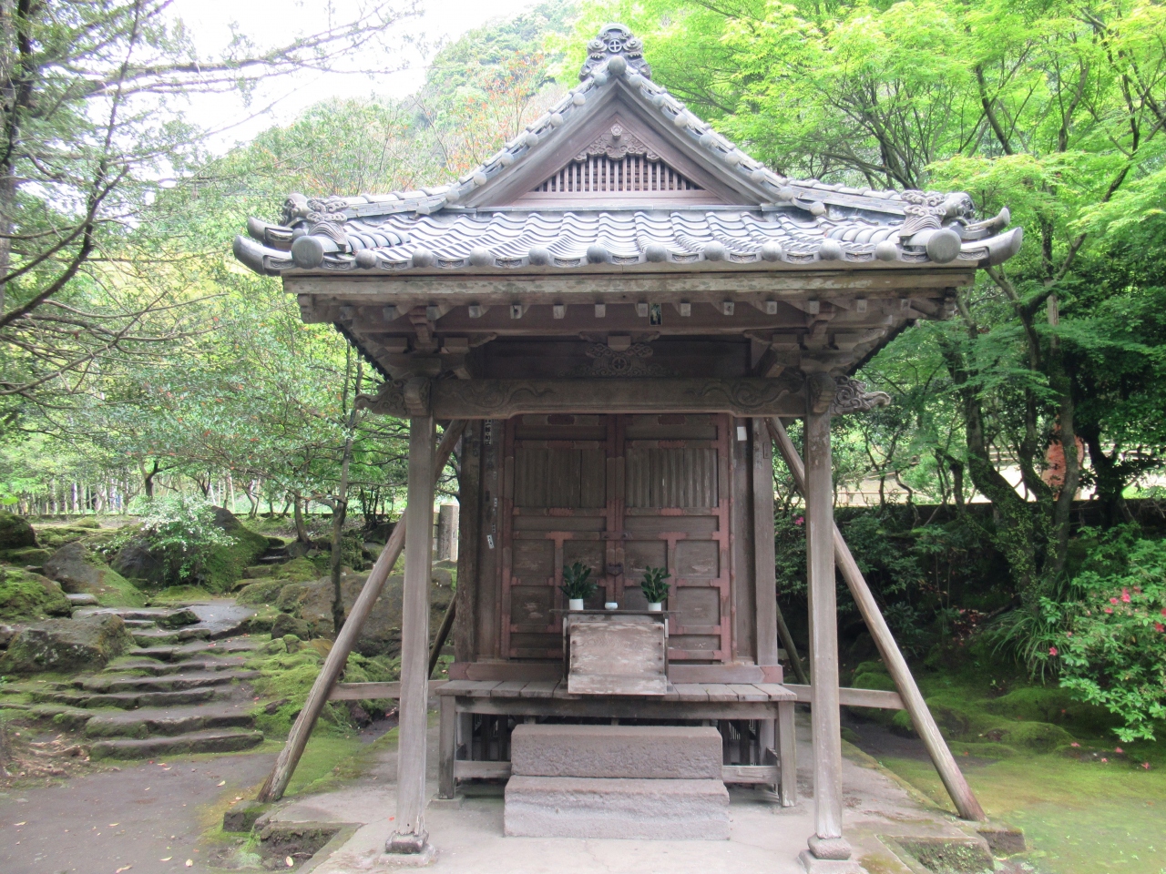 仙巌園の御殿前の広い庭を通り、川を渡り山の斜面を左に進んだところに建つ小さな神社です。木々に囲まれた木造瓦屋根の社殿です。鹿児島城や仙巌園以外の別邸などに散在していた島津家ゆかりの13の神社を明治時代に仙巌園に移したものを、1918年に合祀しました。周りの石や地面に苔が生していて、観光客が多い園内で人が少なく静かな一画でした。