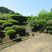 明治以前に建てられた武家住宅で、おとこ玄関とおんな玄関があります。茅葺屋根のおもてとなかえの二つの屋根の間を小棟でつないでいる知覧型二ツ家です。庭のツツジやイヌマキが丸く刈りこまれていて遠くの竹林や木々が借景になっていて奥行きが出ています。住宅を郷土料理店が活用して、庭園に面した座敷に膳が用意されていました。