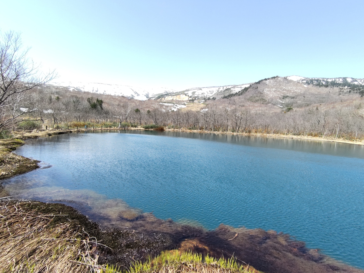 毎年何度か行ってる御在所沼。4月中旬には水芭蕉が咲き始めてました。毎年雪解け水で木道の上を歩くのも大変な箇所がありましたが、今年は水が少ないようです。湿原は一面枯れ草に覆われているようでしたが、ところどころ青い花が咲いていてきれいでした。