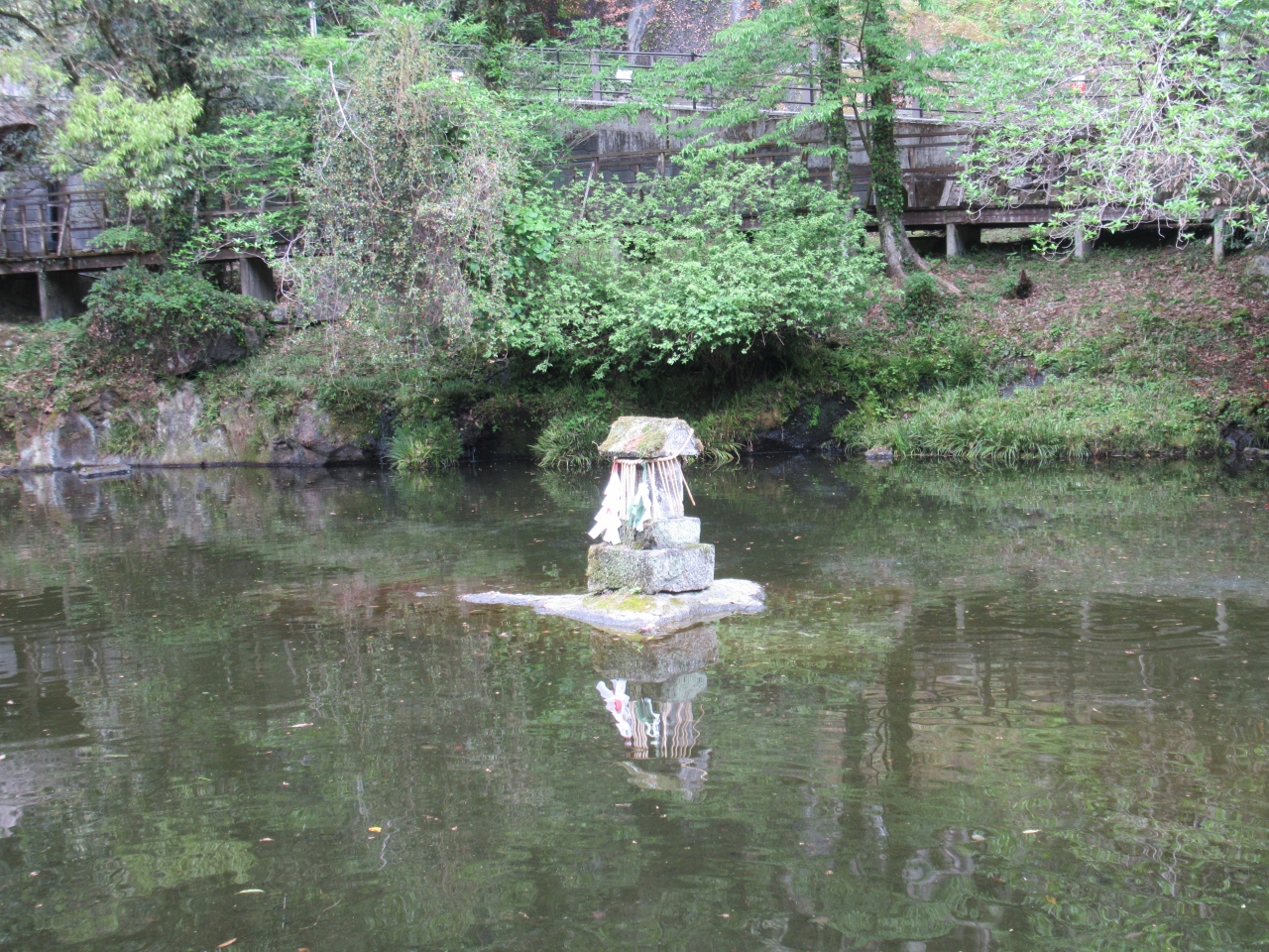 高千穂峡遊歩道を神橋から真名井の滝方向へ歩くと小さな島がある池に着きます。水車があり、鯉が泳いでいる池です。小さな島はおのころ島と言い、イザナキとイザナミが持つ天の沼矛からしたたり落ちた雫が固まってできた島と伝えられています。石の社があり、高千穂神社の春祭で御神幸の神輿がおのころ島を三度回ってみそぎが行われます。池に鯉の他に白いすっぽんが住んでいるそうです。