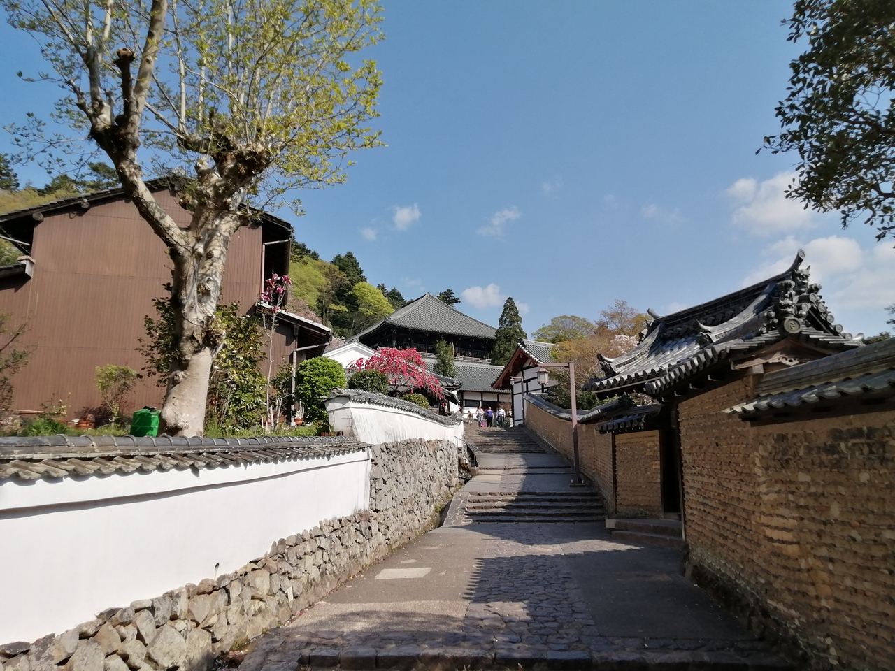 二月堂裏参道を歩きました。観光客でごった返していた東大寺の喧騒はどこかに消えた静かな小路。石畳の路、石垣と白壁、水路沿いの土壁、満開の桜…。まさに私が想像していたとおりの奈良の風情ある通りでした。大仏殿から二月堂へ行く際にはこの路をおすすめします。