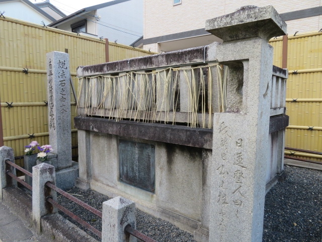 向日神社の大鳥居南側にある大きな石です。京での日蓮宗の布教活動を禁止された日像上人が、1307年にこの石の上で、西国街道を行きかう人々に説法をしたそうです。やはり日像上人ゆかりの石ということで、石柵で大事に囲われています。