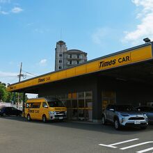 地図で見ると福岡空港の向かいに位置していますが、国内線出口を出て右手方向に進んでいき、歩行者待機用の中央分離帯がある信号を渡ったら、左に向かってしばらく進むとタイムズカーの黄色い看板が見えてきます。