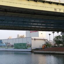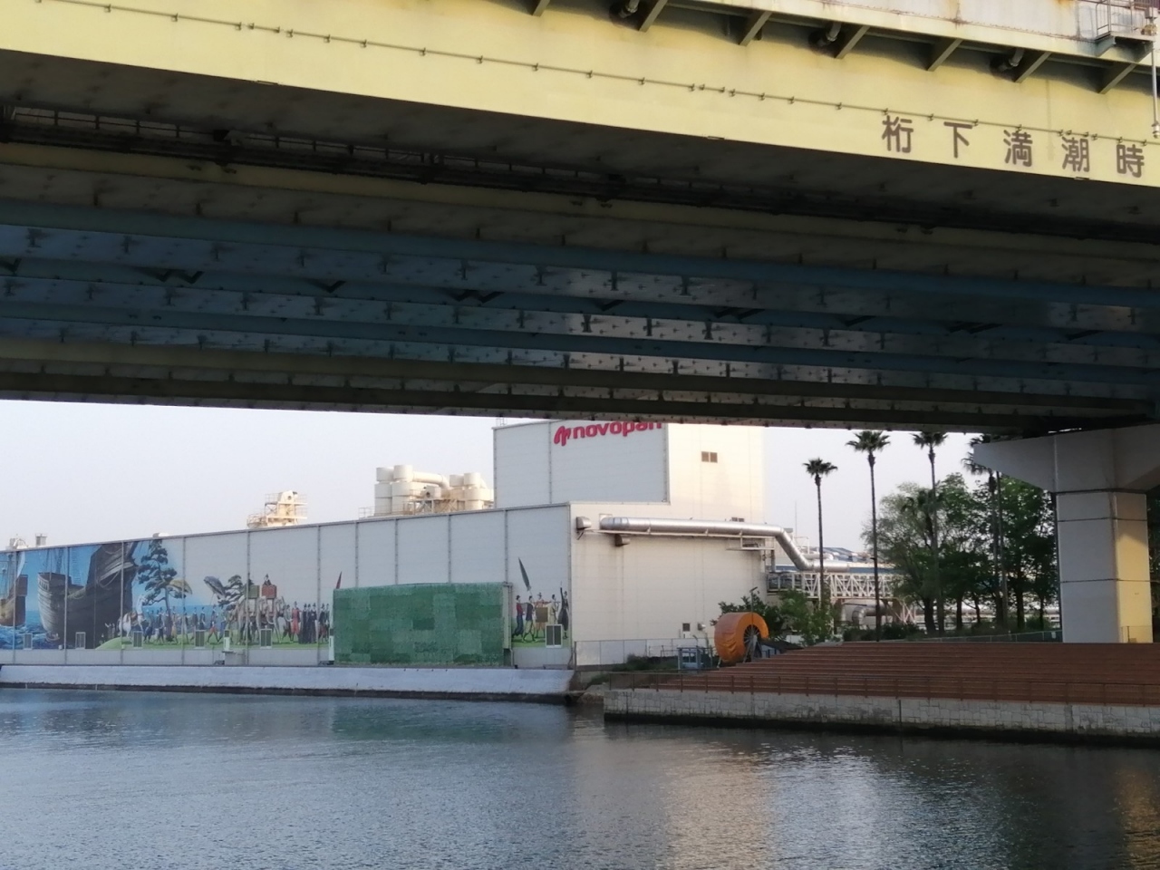 旧堺港の工場の壁面に、巨大な壁画がありました。
