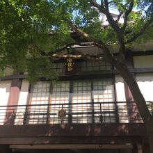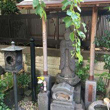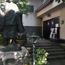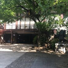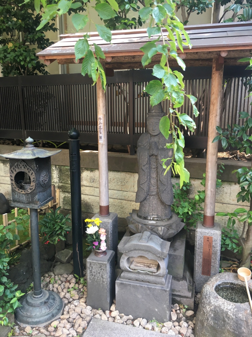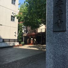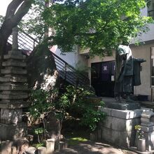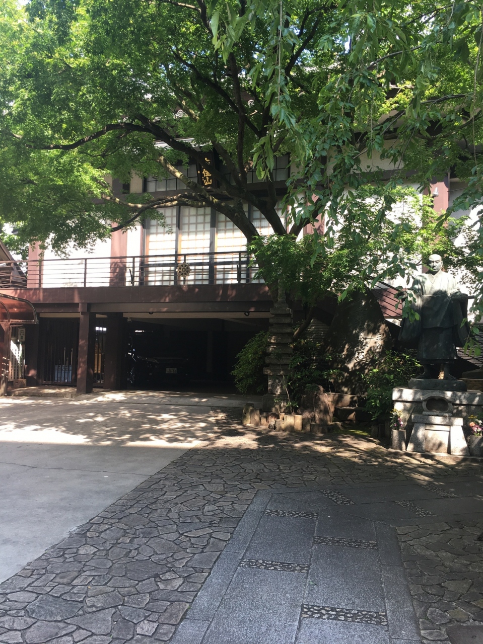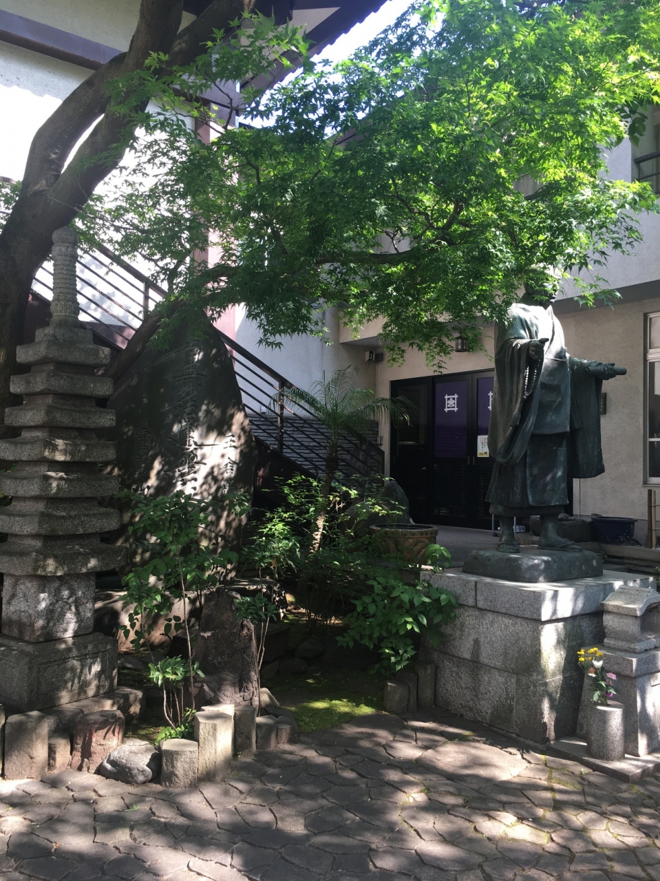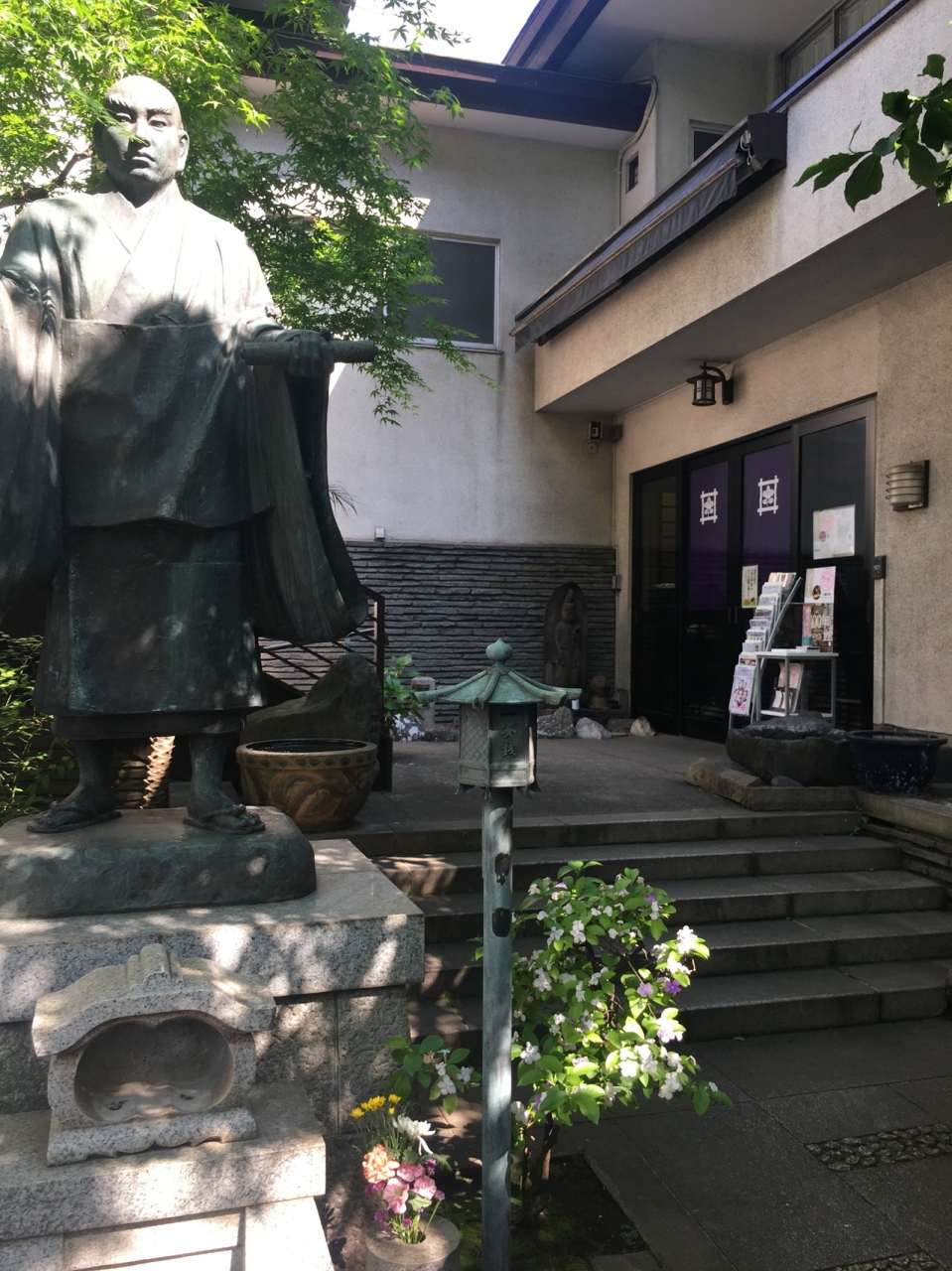 大通り沿いに面した寺。境内入ると空間があり、駐車場も兼ねているような感じで後方には2階建ての本堂があります。大きな木の葉の新緑が見事で、横には精悍なお坊さんの像があり、横には寺務所がありました。本堂の下は空間で駐車場です。