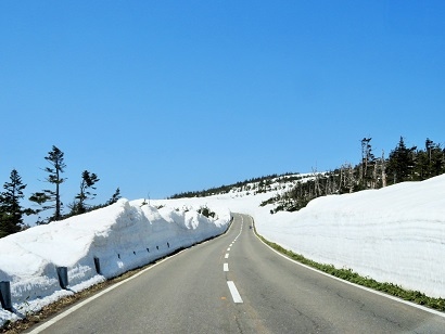 秋田側の展望はイマイチで、展望台も大深沢とふけの湯、おおぬまくらいですが、比較的車も少なく、快適なドライブが楽しめます。特にアスピーテ開通直後は、長くまっすぐ伸びる道路があるので、雪の回廊のハイライトと言えます。