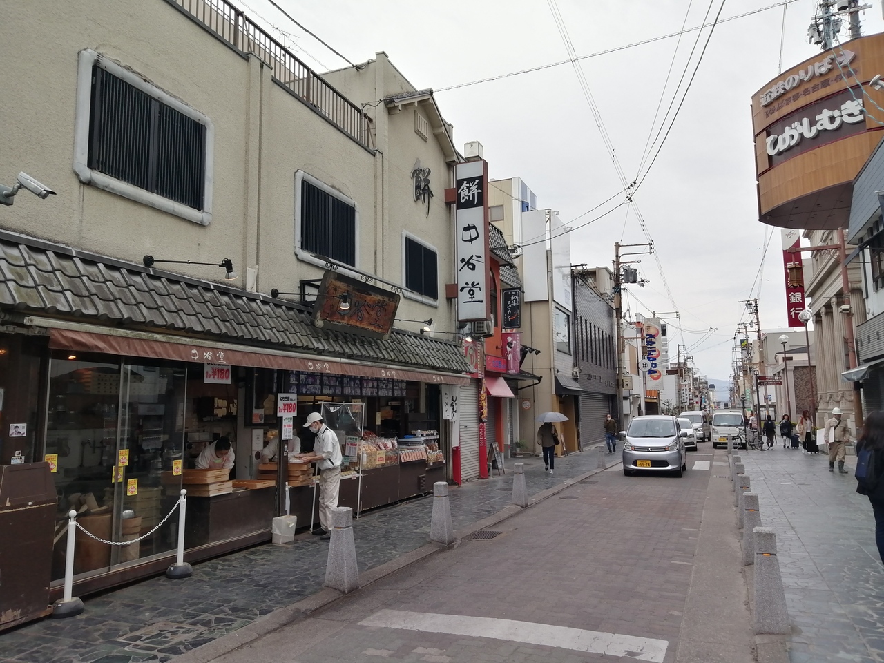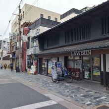 JR奈良駅から猿沢池くらいのエリアでしょうか。老舗の工芸品店や和菓子や土産物屋、ホテル、銀行、コンビニ、飲食店、雑貨店など雑多な店が並んでいます。観光客の多い西側半分はタイル敷きになっており、車も少なく歩きやすい通りです。コンビニも景観に配慮してかシックな和風の外観になっています。