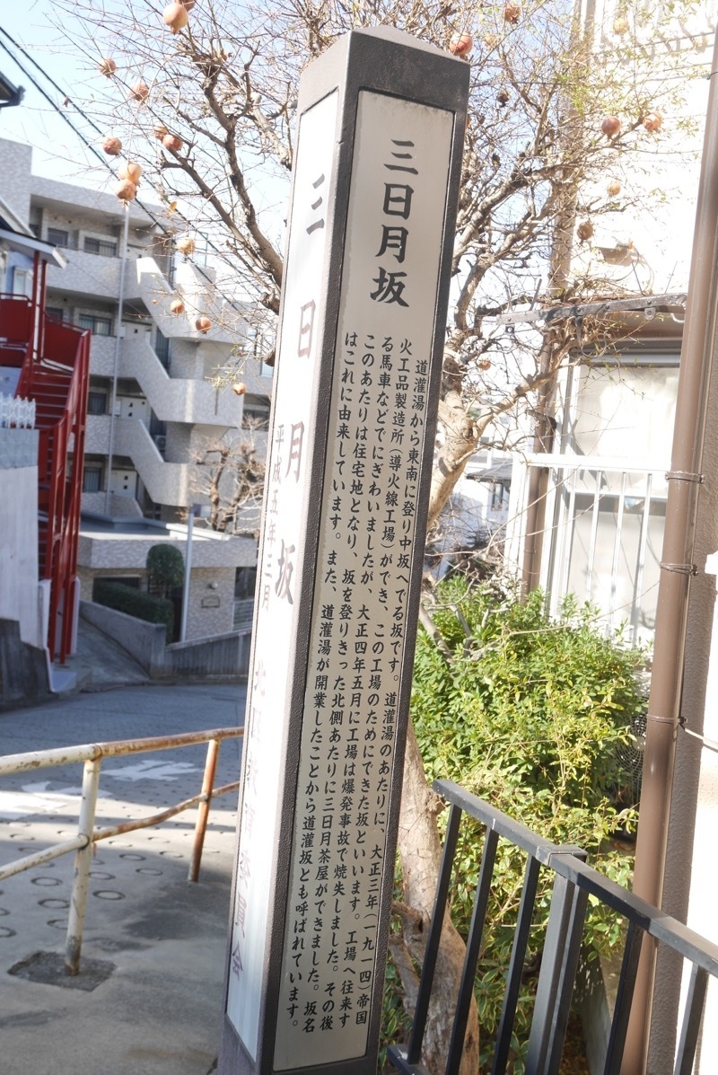 東京に数ある名前つきの坂のうちのひとつです。北区にあり、三日月、というきれいな名前がつけられています。坂から三日月が見えたから…的な想像を勝手にして坂の標識にあるテキストを読むと、近くに三日月茶屋、というお茶屋さんがあったことが理由だったみたいです。坂の路面にでこぼこがあり、歩行者に配慮された坂です。