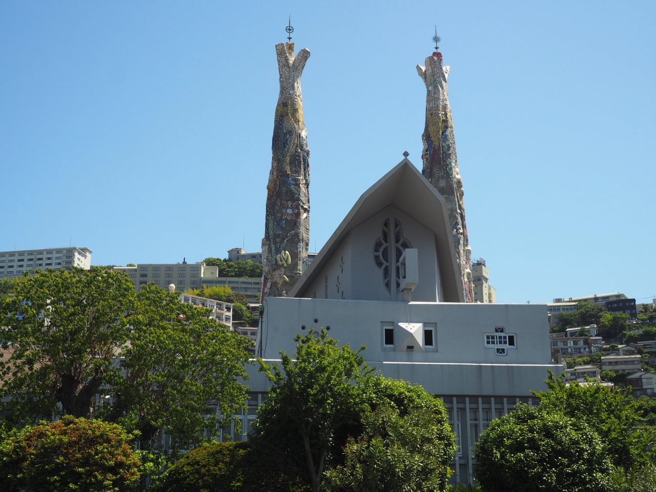 長崎駅の東側の日本二十六聖人殉教の地の記念碑からすぐの場所に聖人記念堂、聖フィリポ教会があります。二十六聖人を記念して建てられた教会です。教会の建物についている尖塔がバルセロナのサクラダファミリア教会の形や雰囲気が似ています。モザイクタイルを張り付けたような外観です。カトリックでは聖人を記念して教会が建てられているので納得です。