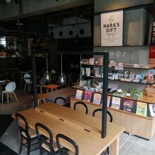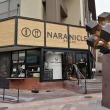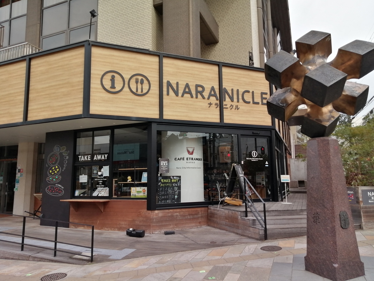 三条通りとやすらぎの道の交差点にあります。交差している場所にあります。変なオブジェと「NARANICLE」の看板。“ i ”マークが付いているので観光案内所らしいのですが、中は完全にカフェ。奈良土産っぽくない奈良土産と観光パンフがちょろっと置いてあるだけ。カフェのおまけのような施設でした。