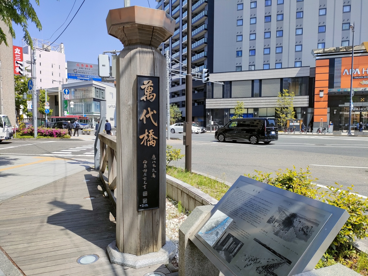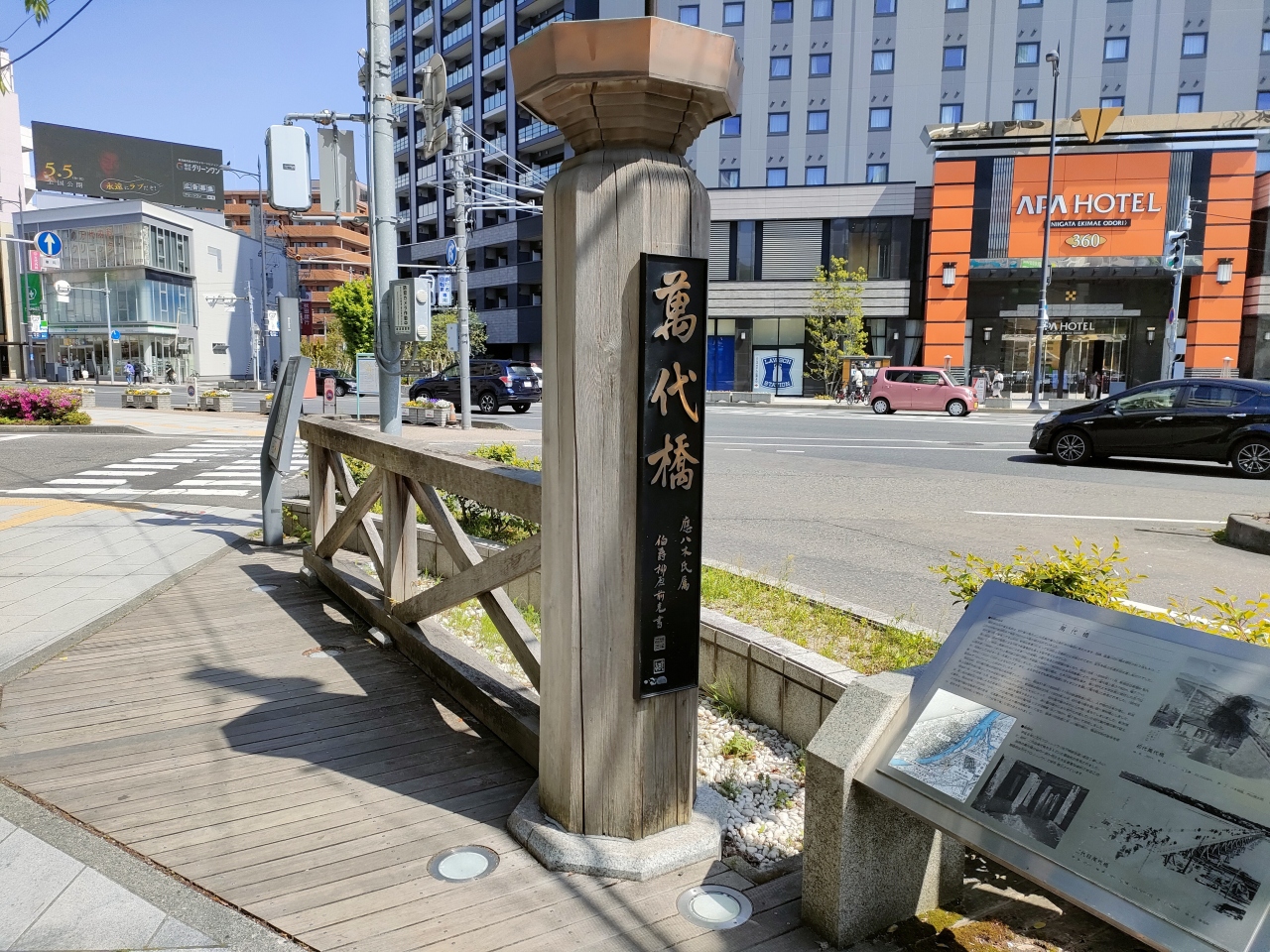 こちらは、道路脇のただの陸地に橋のモニュメントがあるだけですが、昔(初代・二代目)の萬代橋はここから伸びていたそうです。