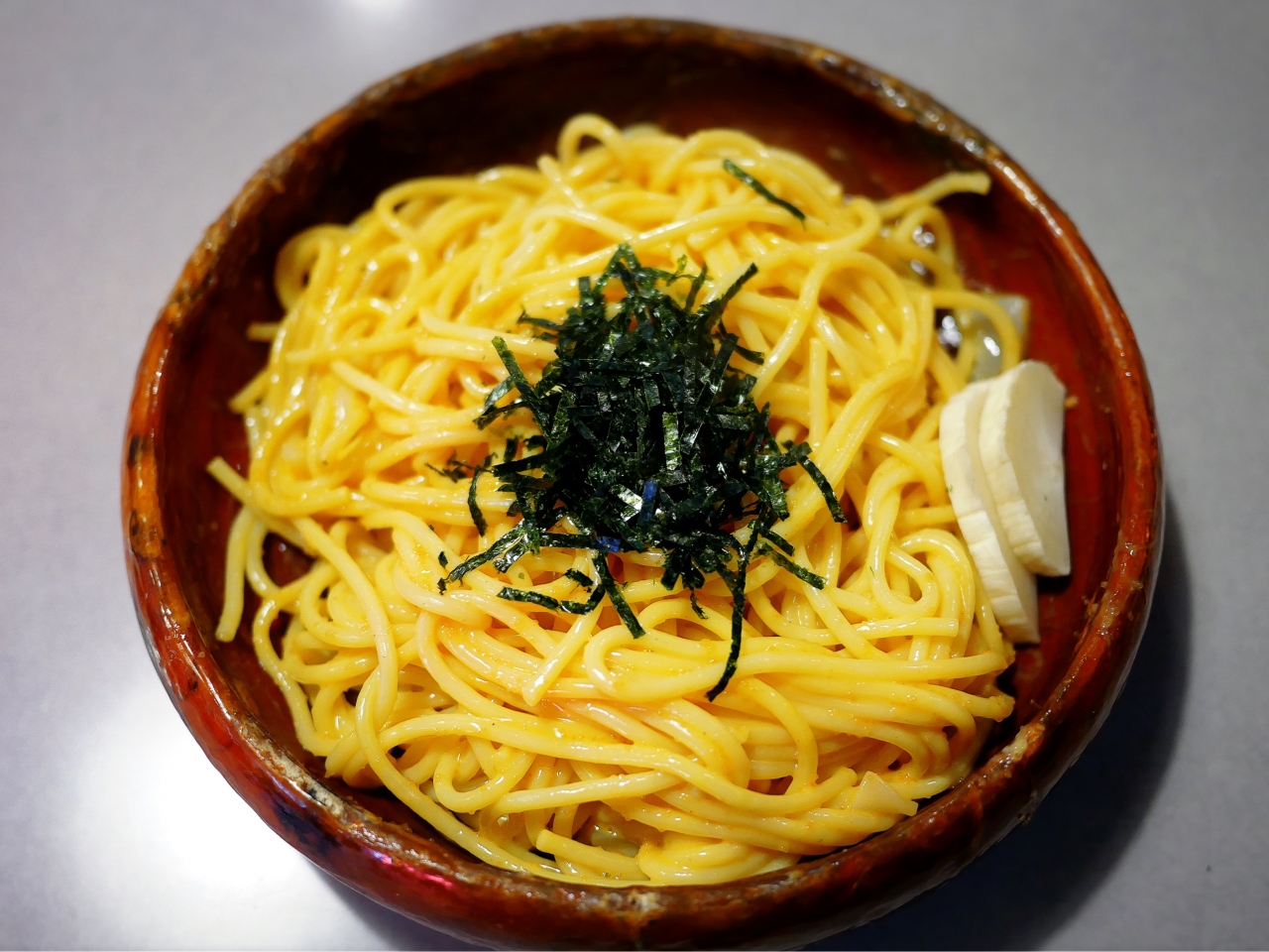 たらこスパゲティのソースと言うと、少しコクが薄い印象があるのですが、しっかりとたらことウニの塩気とコクがあって、美味しくてクセになるソースです。バターも結構入ってるかな。
