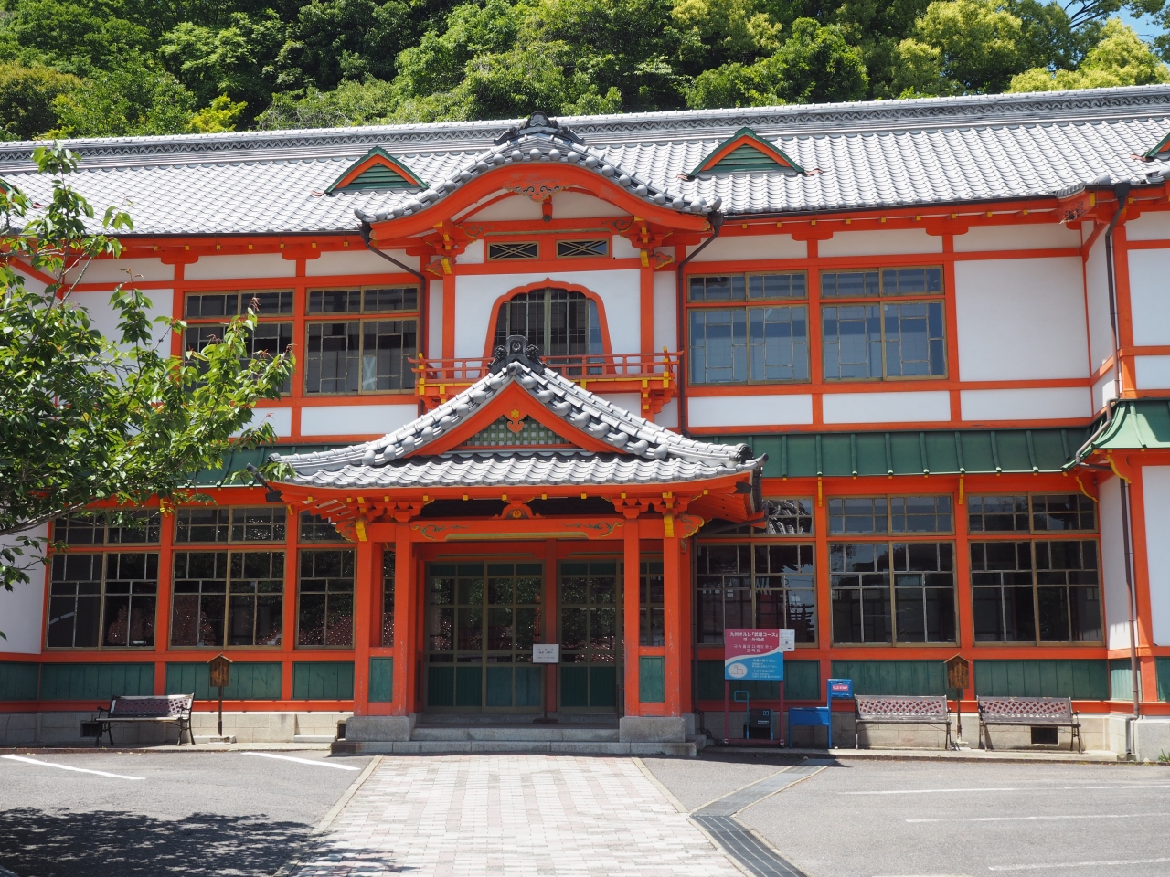 武雄温泉新館は武雄温泉の楼門をくぐってすぐ目の前にある建物です。2階建ての木造の風格も感じさせる建物です。朱色の柱や2階部分の唐様屋根や窓枠の工夫など見どころの多い建築物です。設計は辰野金吾氏で、大正5年に建築されたものです。す。現在は修復されて資料館として無料で公開されています。