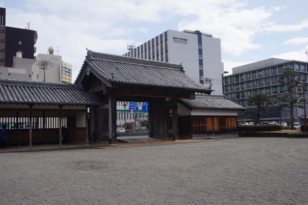 この門から入って振り向くと門の後ろに徳島中央警察署の建物が見えます