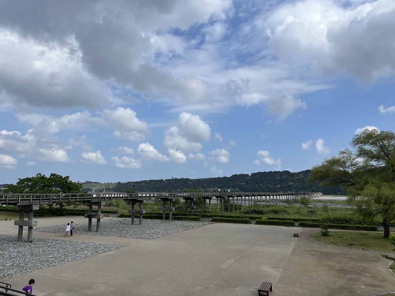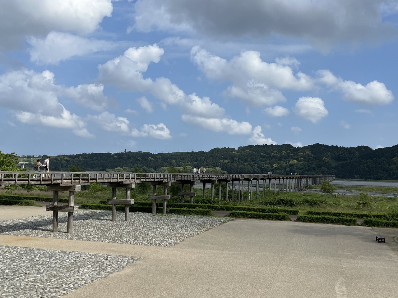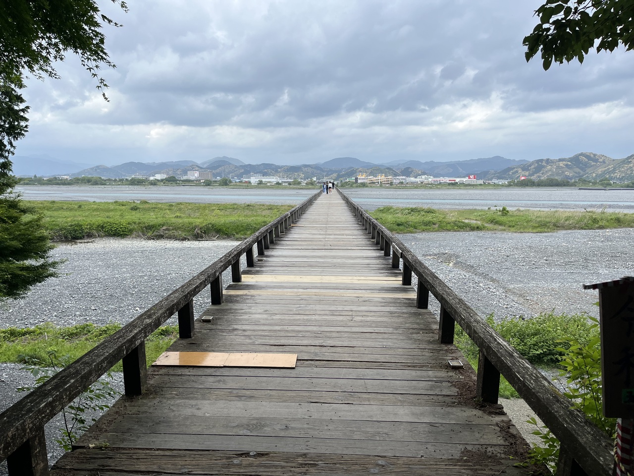 橋は時代劇に出てきそうな感じ。渡り始めると897.422メートルの長さは結構な距離。また欄干が高く無いので、少しの風でも怖く感じるときも。