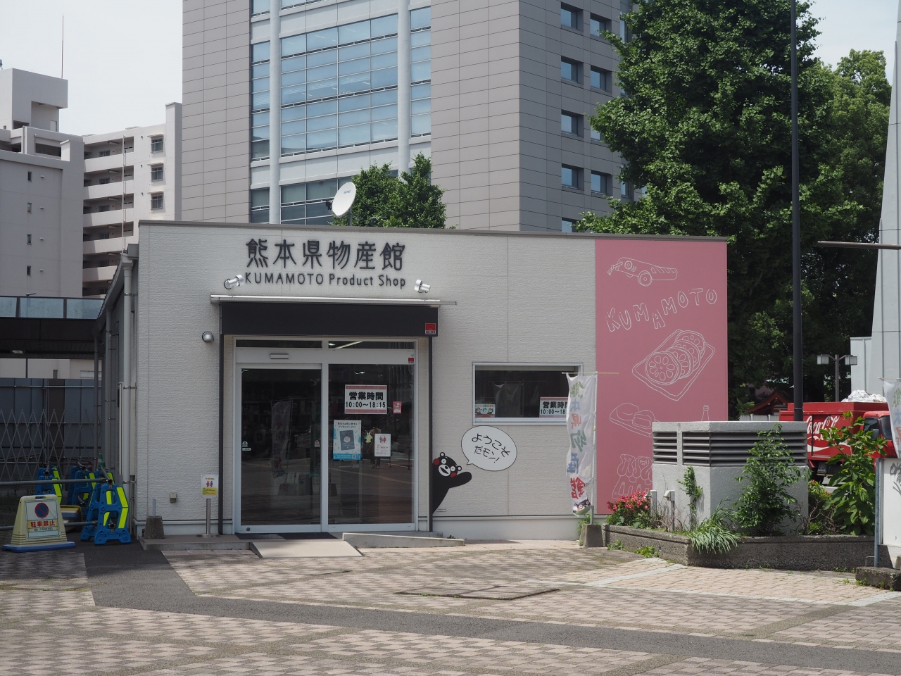 熊本県物産館はサクラマチクマモトから坪井川、熊本城方面へと歩いていくとすぐにあります。平屋のこじんまりとした建物です。建物内はくまモングッズをはじめお菓子類や食品、焼酎など熊本県のお土産類が豊富にありました。隣の建物が改装中であるので、完成後はそちらに入居するのかもしれません。