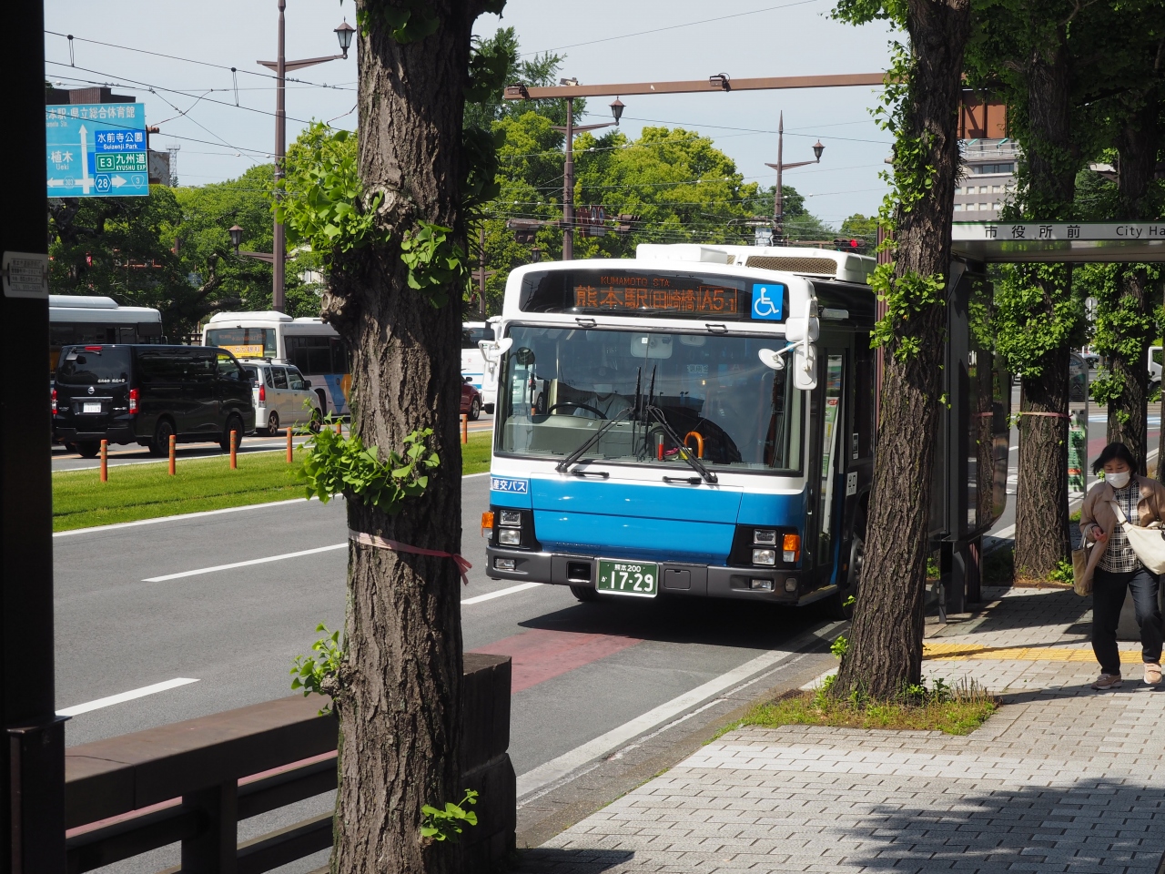 観光地に来て路線バスに乗るのは少し難易度がありますが、市街地や観光地からターミナル駅には特に迷いなく便利です。市役所前のバス停で待っていると幸い熊本駅行きが来たので乗車しました。熊本には熊本都市バスと産交バスが走っていますが、熊本市内では同じようコースを走っているので区別は必要なさそうです。