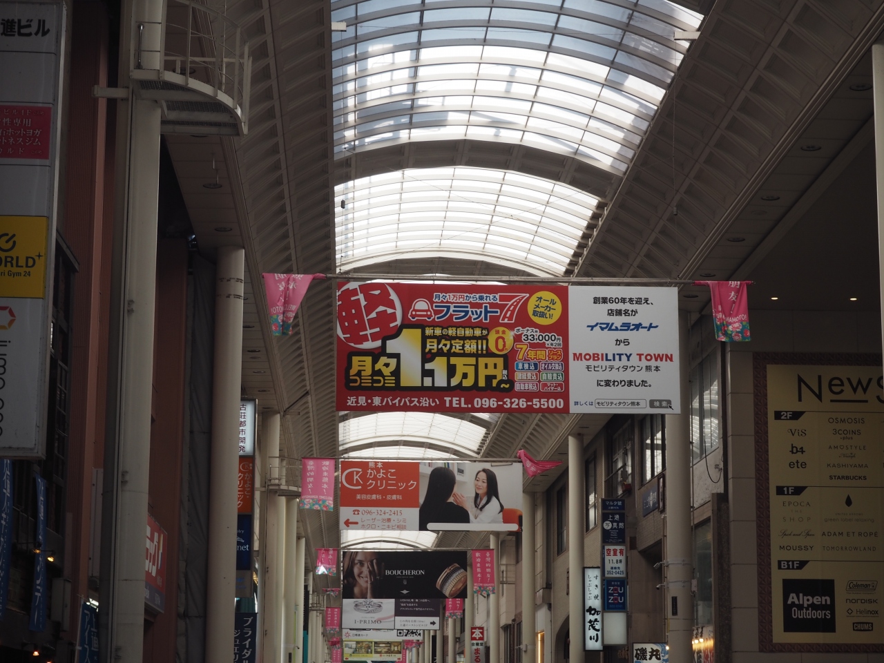 上通り商店街は熊本市街地の中心にあり、道路挟んで下通商店街や籠町商店街と一体になったアーケード街をつくっています。上通商店街の続きは籠町商店街です。下町商店街とはアーケードの高さや様子は違いますが、買い物客などは一体として歩いているような気がします。下町商店街と比べるとにぎやかさなどは少し少なめのような気がします。