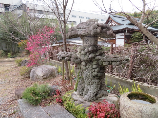 天台宗のお寺です。境内に小さな門があって、こちらから「開運大庭」というすごい名前のお庭に入れます。石塔などはありますが、さほど特別なお庭ではありません。びっくりしたのは灯籠でした。石でゴツゴツしていて、ロボットみたいでユニークです。
