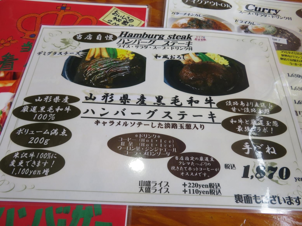 ほかにもカレーも数種あったり、米沢牛ハンバーグとタンドリーチキンなどのコンボもあり。