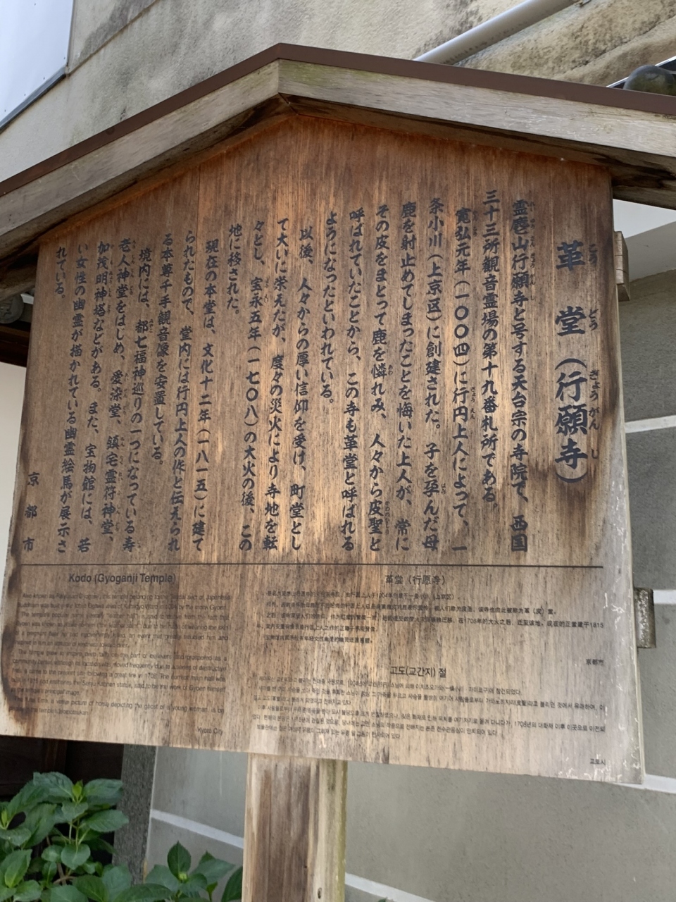 天台宗のお寺です。開基は行円上人。ご本尊は千手観音菩薩、1004年の創建だそうです。説明板にもありますが、妊娠したは母鹿を射止めてしまったことを後悔した行円上人が密教の行者として、その鹿の皮をまとって鹿を憐れんでいたことから、皮聖とよばれ、革堂(こうどう)と呼ばれるようになったそうです。本来は一条にありましたが、火災などで場所も移り、現在の本堂は1815年に建てられたもの。西国三十三所観音巡礼の第十九番札所です。町堂として人々の信仰を集めていました。境内にある高さが約3mの五輪石塔は鎌倉時代のもので、賀茂明神塔といわれています。言い伝えによると、行円上人がご神木で、千手観音像を造ったことに対してのお礼で造られた塔といわれています。