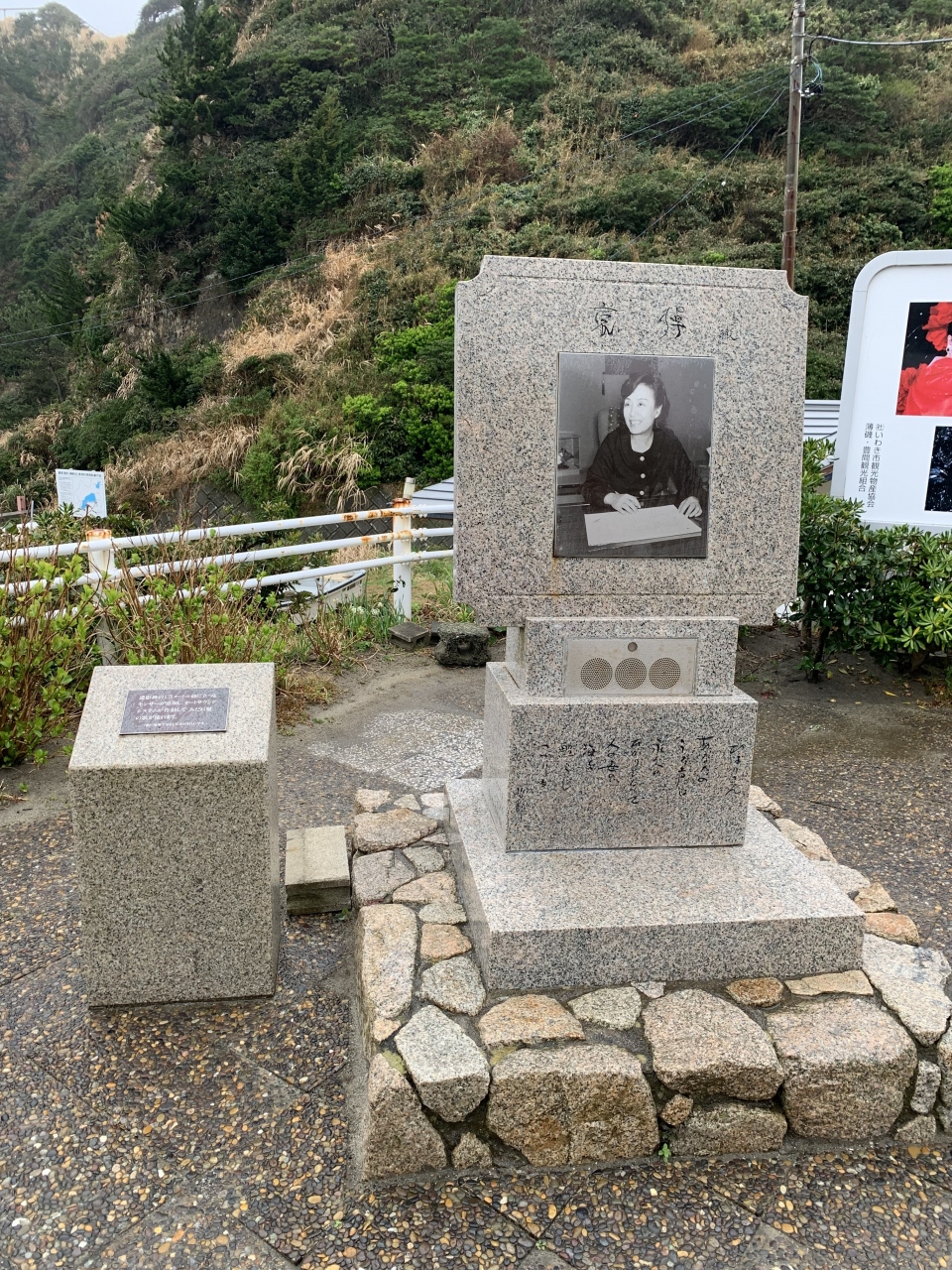 塩屋岬の麓の「雲雀乃苑(ひばりのその)」から岬を眺めました。美空ひばりさんが大病後の復帰第一弾として発表した名曲「みだれ髪」は、この塩屋岬が舞台でした。それにちなんで歌碑、遺影碑などがあります。この場所からは塩屋埼灯台も望めます。