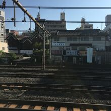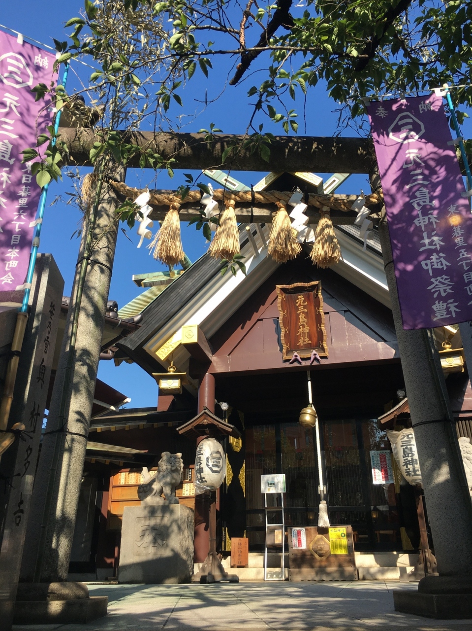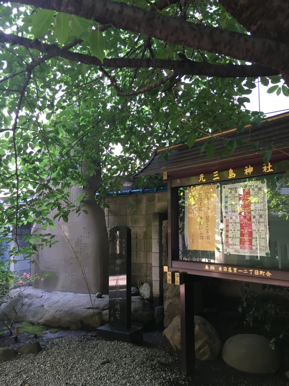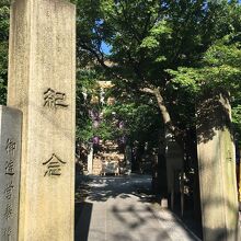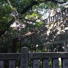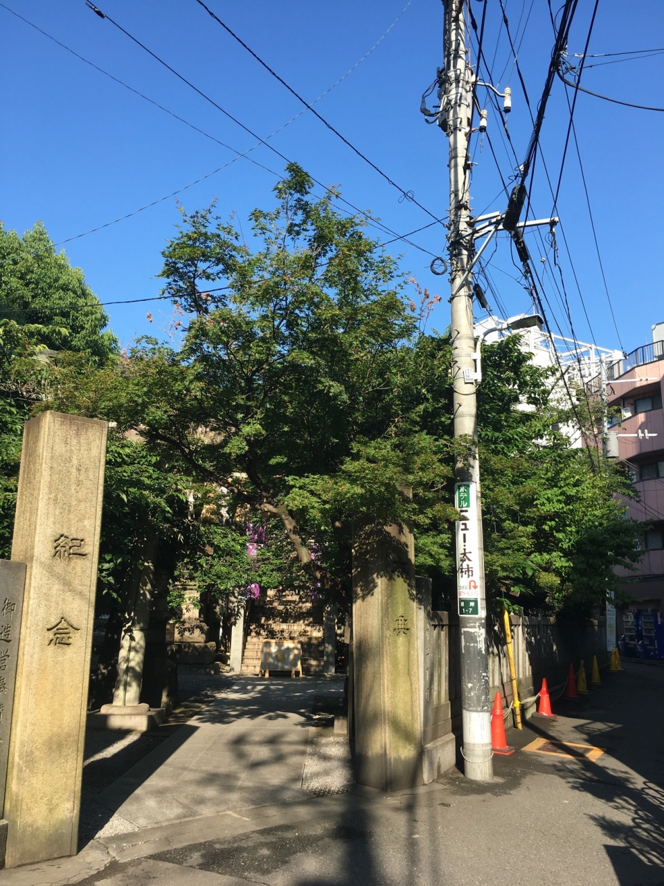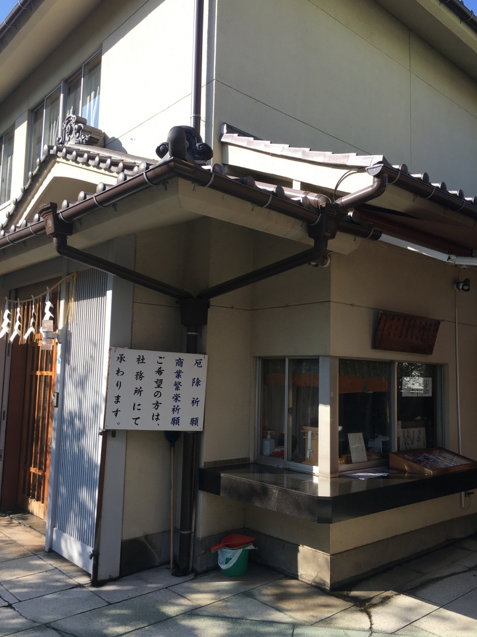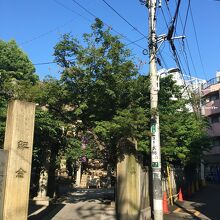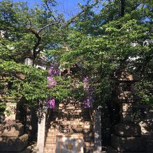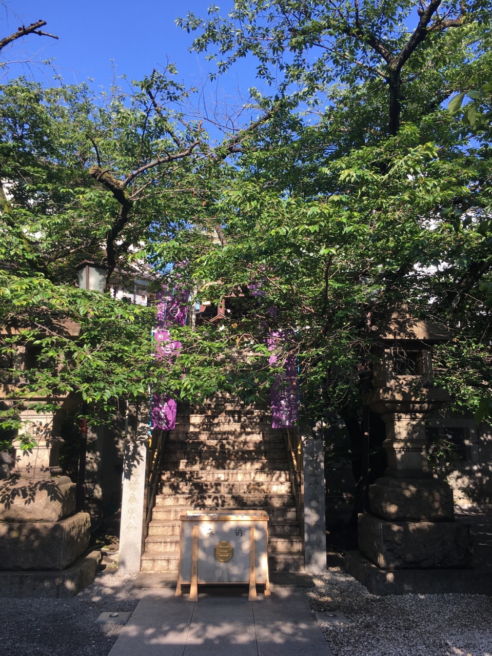 鶯谷駅前北口のほぼ前にあり,駅のホームからも見えました。路地裏の細い道にある神社で、階段を上がり参拝することとなります。新緑が見事で階段まで枝が伸びて、紫の旗がたくさん靡いていました。社殿の横には社務所もあります。