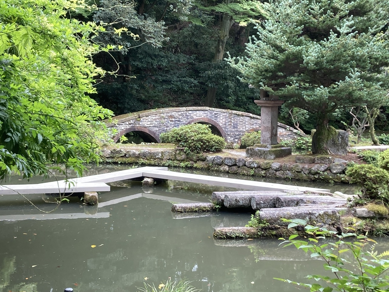 尾山神社にはこぢんまりとした静かな庭園がありました。金沢城公園を挟んで向こう側に指折りの庭園である兼六園があるため、それと比較されてしまうと何ですが、休憩がてらぶらり散策するには疲れなくてよい、ちょうど良い大きさです。 小さめの池に小島が浮かぶいわゆる池泉回遊式庭園の形ですね。