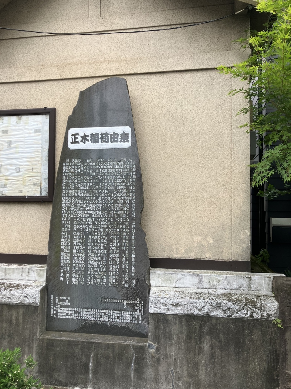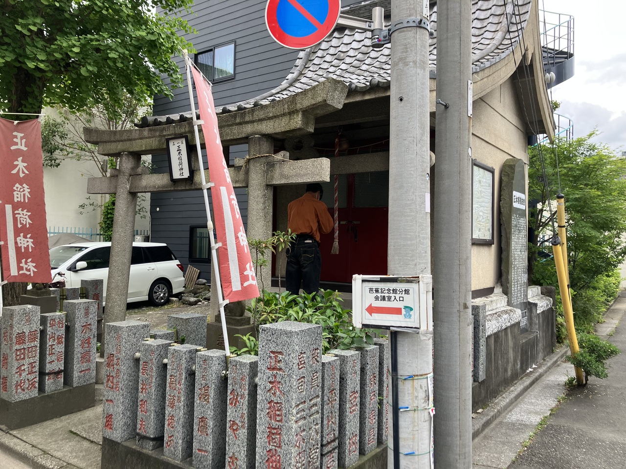 東京メトロ半蔵門線「清洲白河駅」から徒歩で10分ほどです。「萬年橋」の北、小名木川と隅田川の合流点近くにありました。境内に柾木の大木があったので「柾木稲荷神社」とも言われていました。「江戸名所図会」にも描かれています。「おでき」「腫れ物」を治すご利益があるそうです。