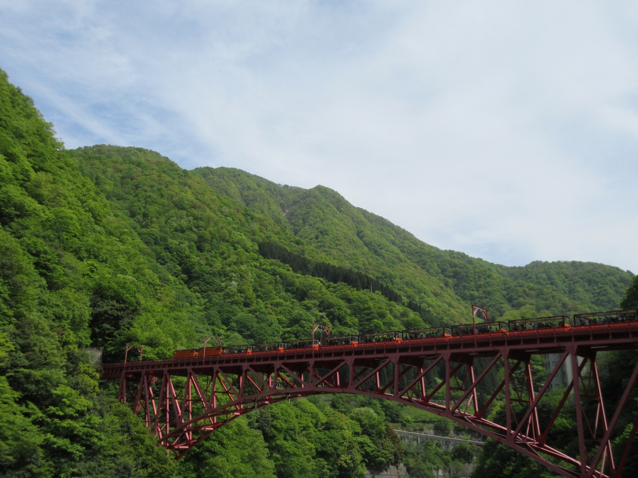 この場所から黒部川にかかる新山彦橋を渡るトロッコ列車の背景に雄大な山々がそびえ立ています。春から夏にかけては新緑、秋は紅葉が美しいです。
