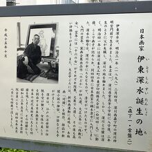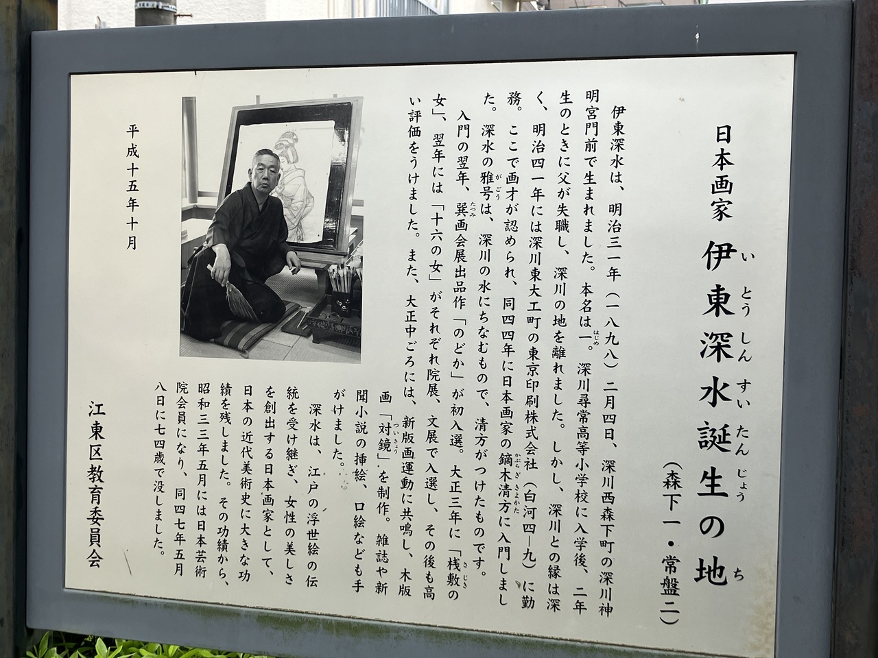 都営地下鉄大江戸線「森下駅」から徒歩で3分ほどです。「深川神明宮」の門前に説明プレートが立っています。深水は大正昭和期の日本画、美人画の大家です。鏑木清方に師事、「深川の水」にちなんで「深水」の画号が与えられました。上村松園、鏑木清方、伊東深水を近代を代表する美人画の三巨匠と呼ばれ浮世絵の流れを継承しつつ現代の画風を追求した優れた作品を描きました。娘にテレビでもお馴染みの女優朝岡雪路さんがいます。