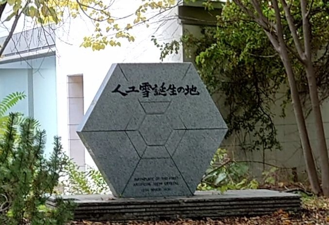 北海道大学キャンパス内の大野池近くにありました。雪の結晶を模した石碑で結構な大きさがあり石碑には「人工雪誕生の地」と刻まれていて目立ちました。