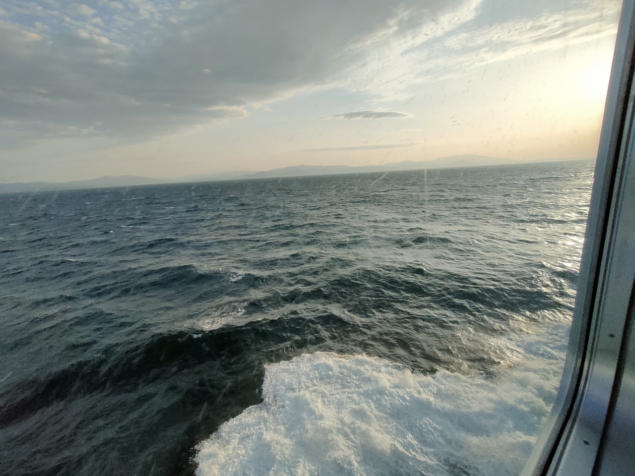 神威岬上から俯瞰するのとまた違う角度から眺める岩が新鮮で、遊覧船ほど間近では眺められないものの、小樽→新潟への移動がメインで、景色はついでと考えると、高いクルーズ料金を支払う必要もありません。
