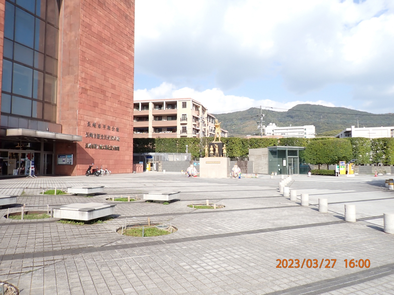 長崎市観光で立ち寄りました。原爆殉難教え子と教師の像は、長崎原爆資料館見学後、長崎市歴史民俗資料館に向かて歩いていると、長崎市平和会館前(南側)の広場に建っていました。先生と思われる男性像と男女4人の子供たちの像で、金色に光っているのが印象的でした。