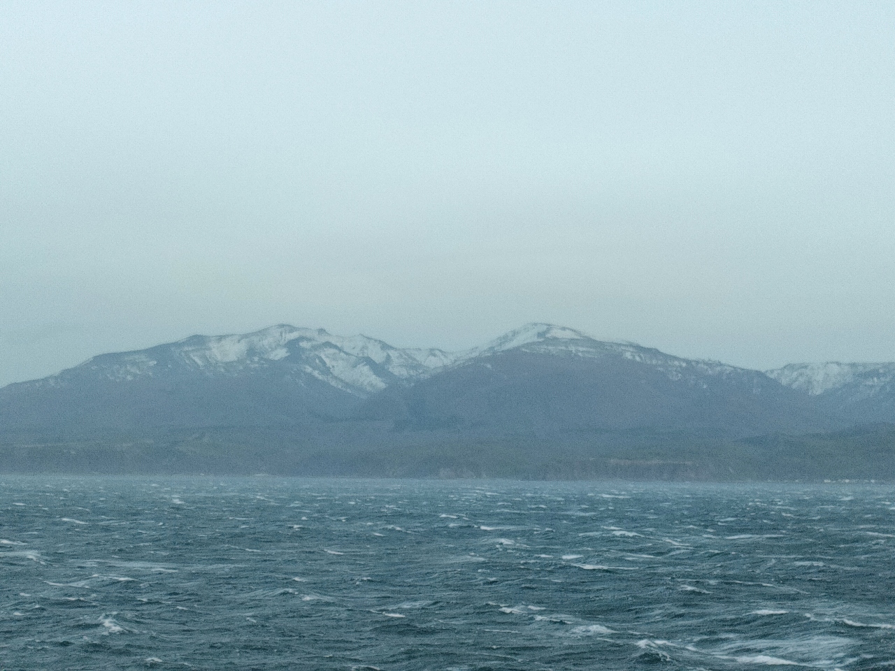 いつも見る陸地からの風景と異なり、波濤の向こうに荒々しい岩礁風景が連なり、その背後に雪をたたえてどっしりと構える迫力ある積丹岳です。