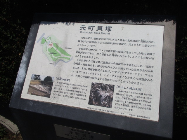 元町貝塚は昭和49年に外国人墓地の北東斜面に縄文時代中期初頭の貝塚の貝や土器が平成18年アメリカ山公園建設前の発掘調査行った際に貝塚が発見されたそうです。貝塚は海を見下ろす高台にあるという定説通り横浜山手の高台に住居があり、貝塚の断面写真や出土した土器の写真が説明板に展示されてました。残念ながら説明板があるのみです。 みなとみらい線元町中華街駅アメリカ山公園口よりエレベーターで屋上の西洋風庭園のアメリカ山公園の左側のベンチ近くに元町貝塚の説明板がありました。港の景色と薔薇の花が素晴らしかったです。
