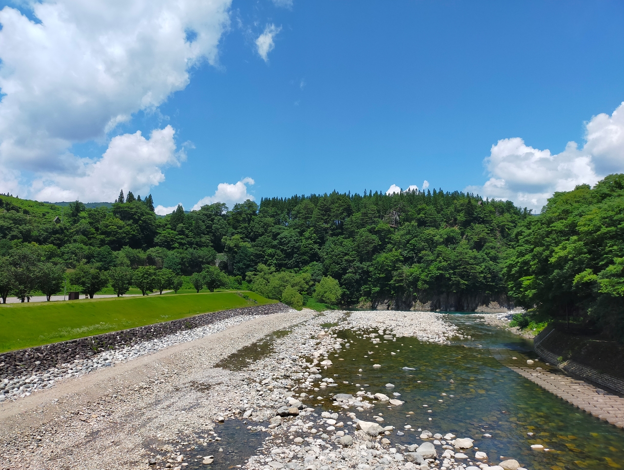 庄川自体は何度も見たことがありますが、白川郷を訪れたときに、であい橋の上からゆっくり眺めることができました。富山県あたりでは、川幅が広く深さもそれなりにありそうな印象でしたが、白川郷では川幅は狭く浅い川のようでした(時期や天気にもよるかもしれませんが)。川の水は澄んでいて、橋の上からの景色はとてもきれいでした。