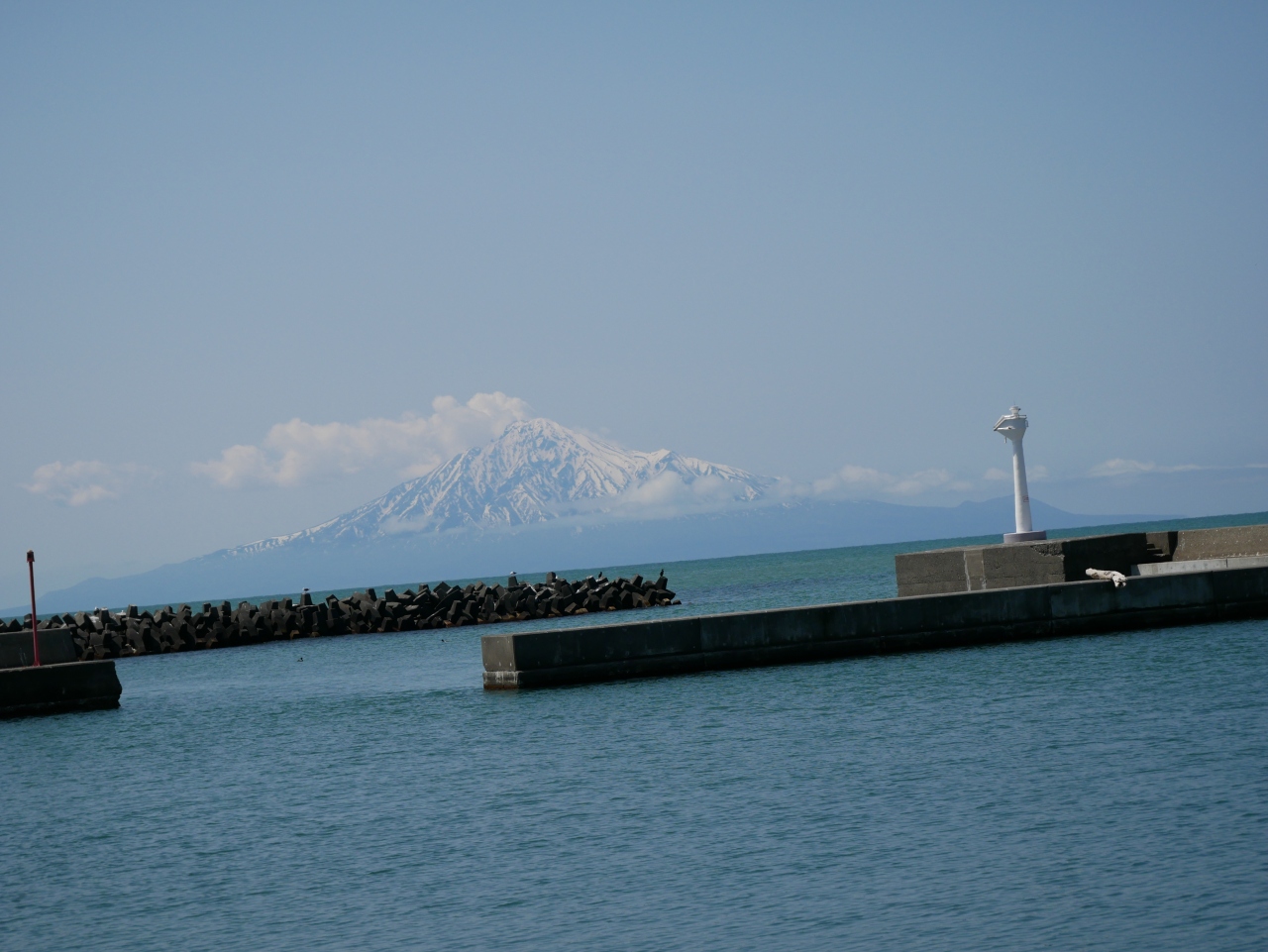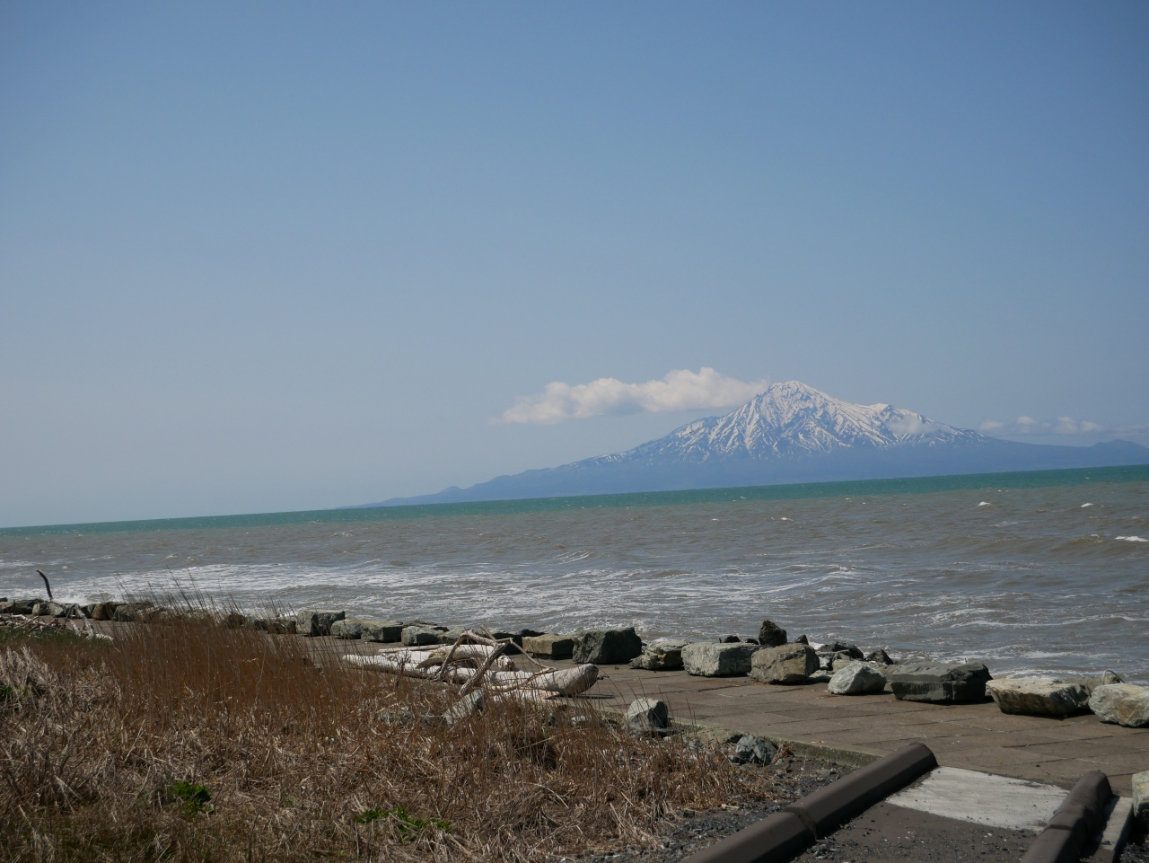 メインの観光地とはなっていないせいか、車通りも少なく、快適なドライブコースです。しかも、道路のほとんどの部分から海岸線や港を眺めることができ、何といっても、海の向こうに見える雪をかぶった利尻富士がすばらしかった。
